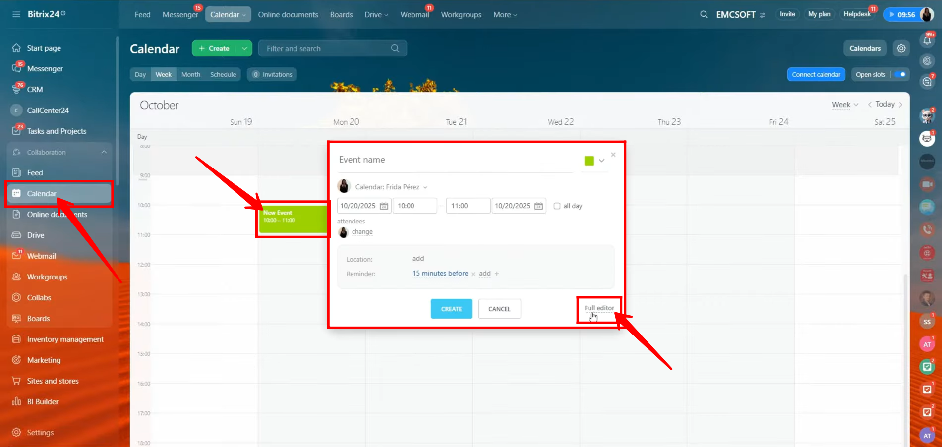 1. To schedule an internal meeting, navigate to the “Calendar” section from the left panel. Click on the available time slot for the desired date, and a quick editing box will appear to enter meeting details. To access all configuration options, click on “Full Editor” to open the complete event setup window.