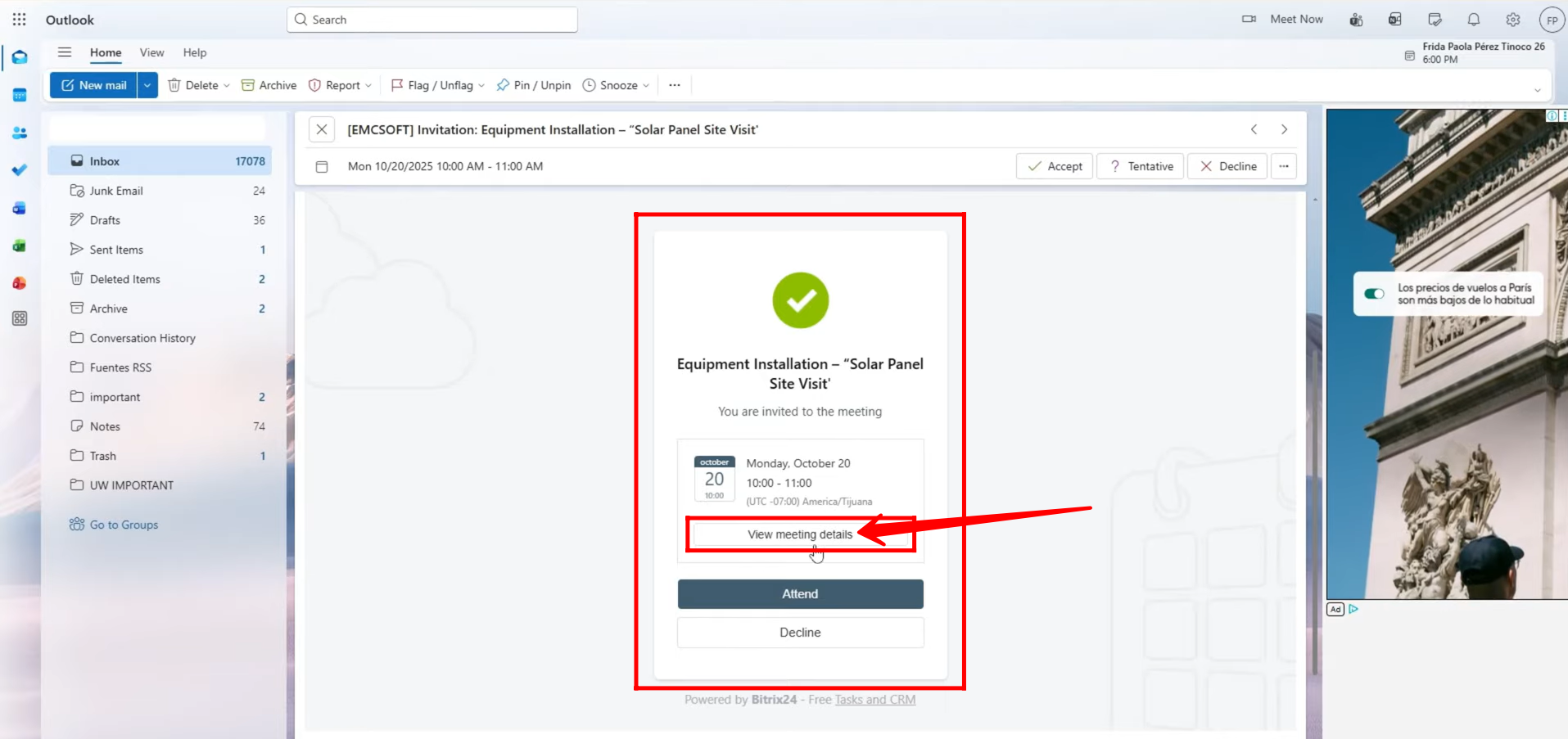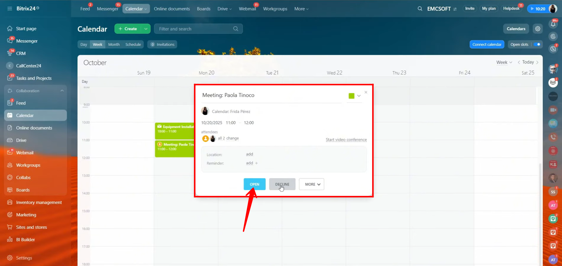 26. Here, you can either decline the meeting request if the proposed time doesn’t suit you, or open it to view the complete meeting details. Click “Open” to access the full information about the scheduled meeting.