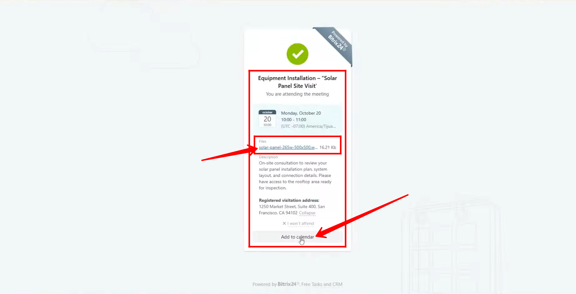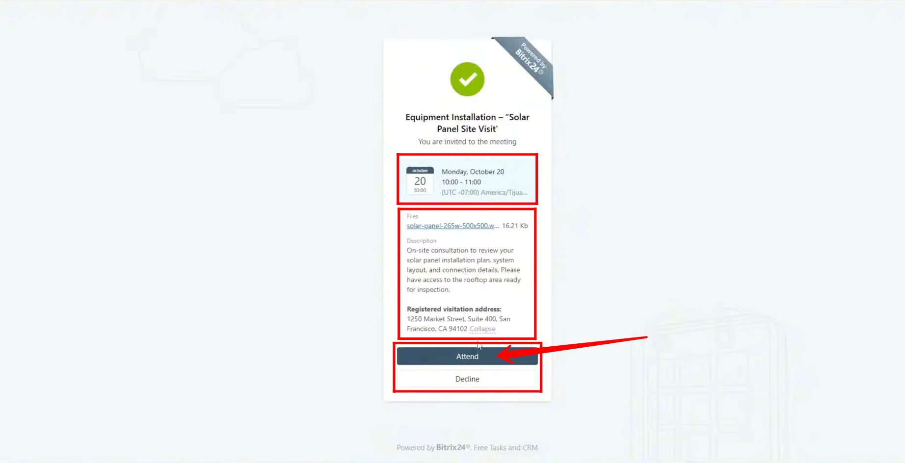 Additionally, if the organizer attached any media files (such as images, documents, or presentations) to the event invitation, attendees can click on these attachments to open and view them in a separate browser tab for full access and review before the meeting.
