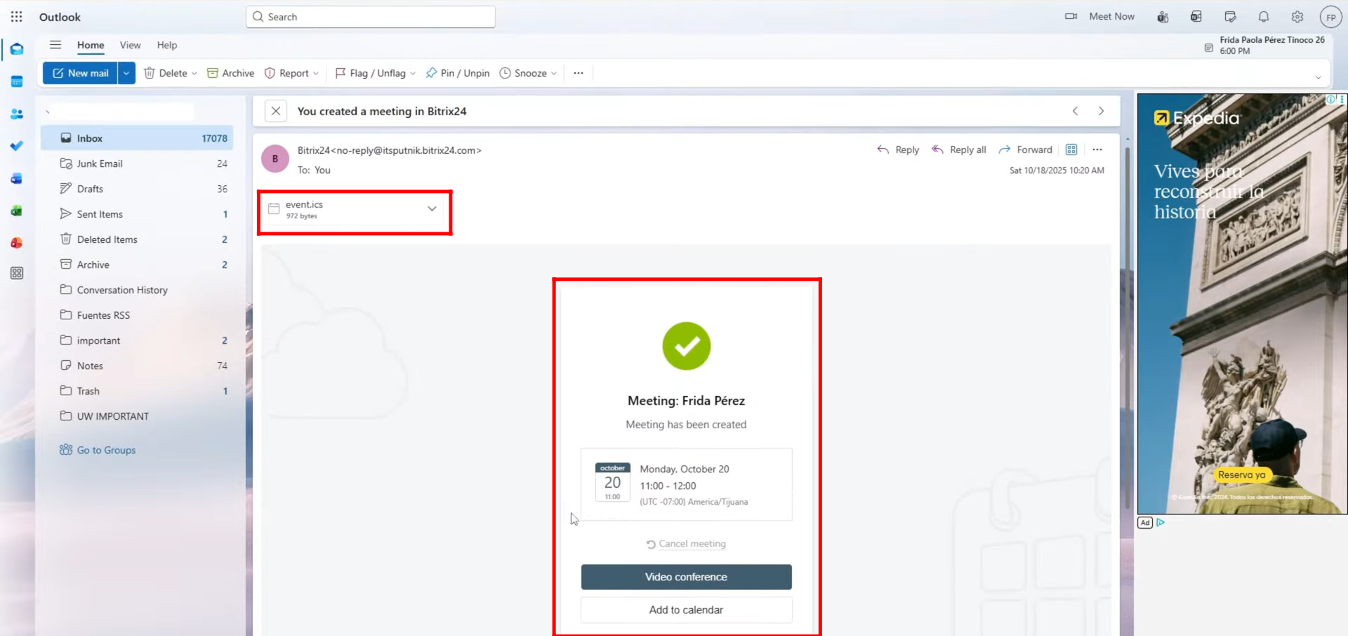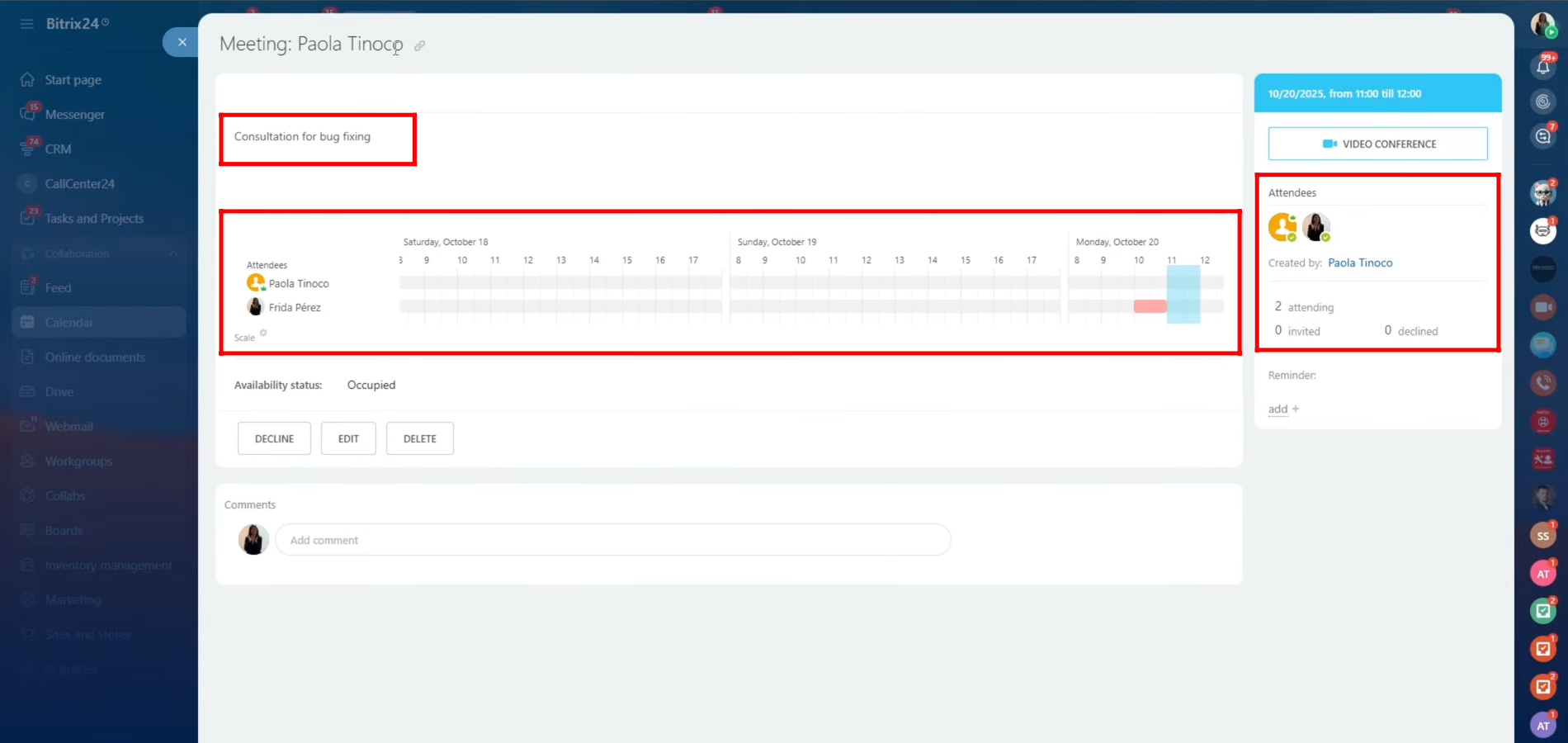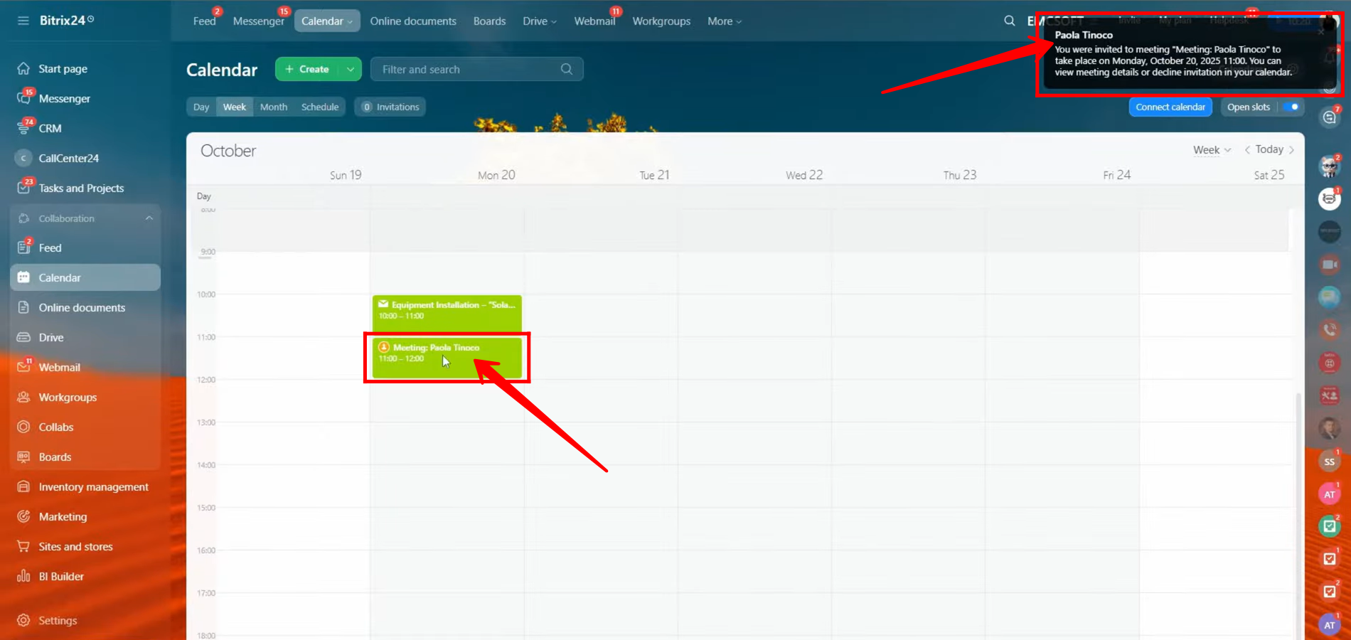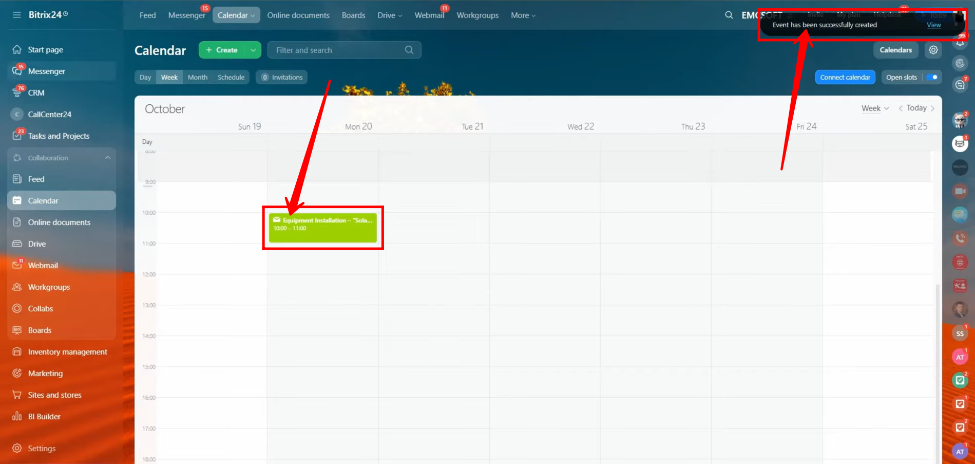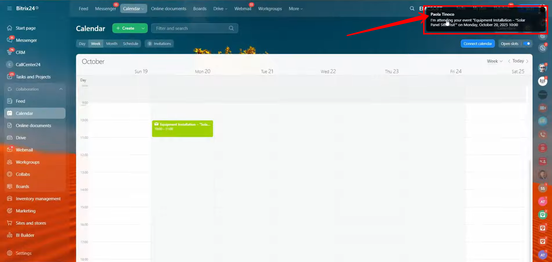9. After saving, you’ll receive a notification confirming that the event has been created successfully. The scheduled meeting will now appear directly on your calendar, displayed within the specific date and time slot you selected. This allows you to visually track your event alongside other scheduled activities in your Bitrix24 workspace.