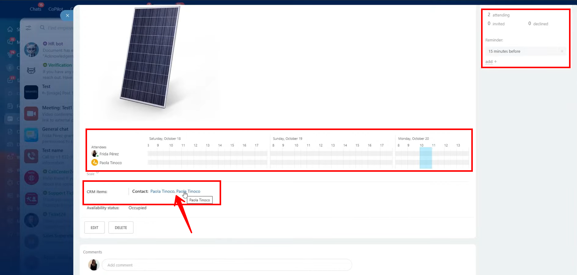 Additionally, you can view the connected CRM item (such as a deal, lead, or contact) linked to the event — simply click on it to open and review the related CRM record.