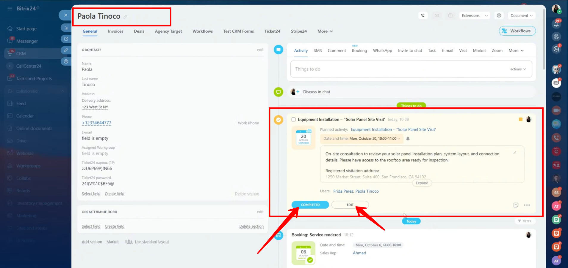 17. Since the CRM item (contact) was attached to the event, opening the contact card will show the event automatically listed in the activity timeline. From this timeline, you can view all event details, edit the event if any updates are needed, or mark it as completed once the meeting has taken place.
