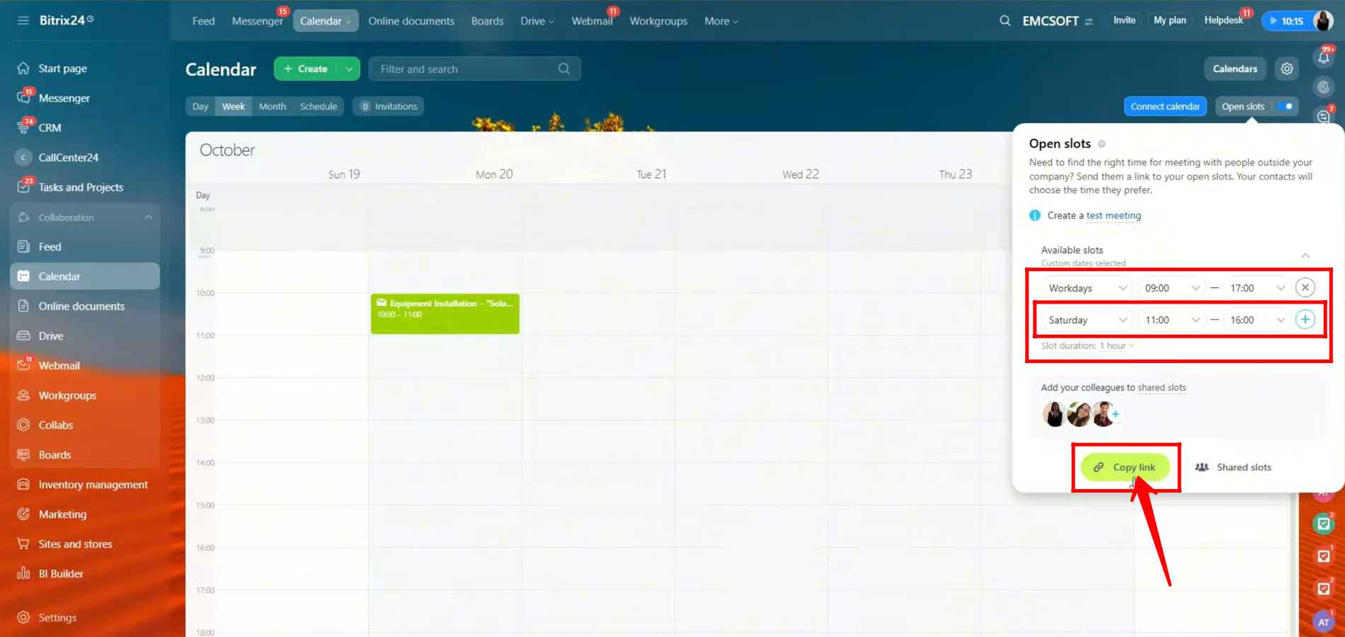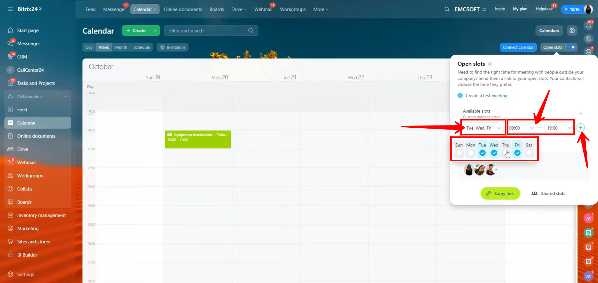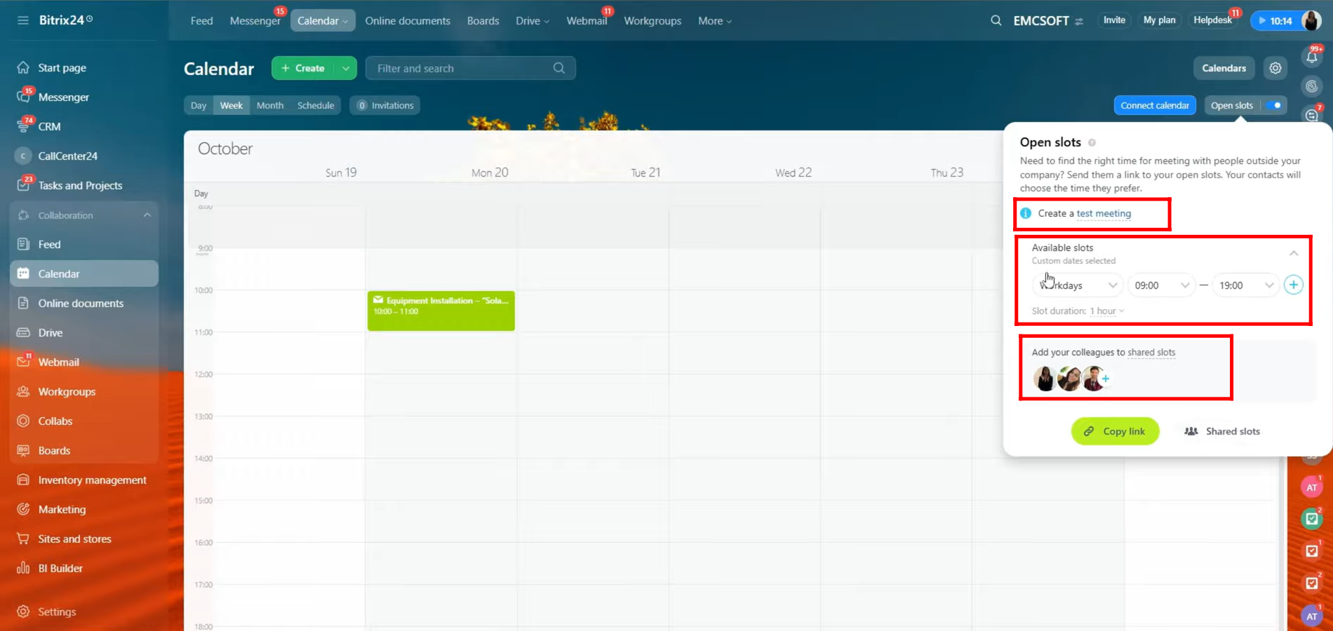 19. You can now create a test meeting to verify how the open slots feature works. While setting it up, you can also add your colleagues to the shared calendar so they can be part of the available slots as well.