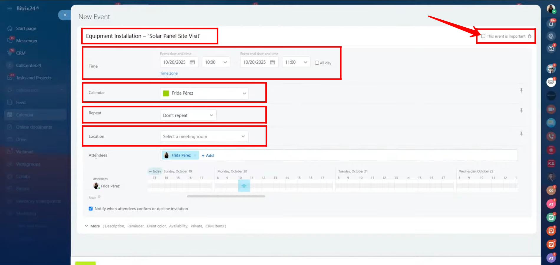 2. In the detailed editing panel, enter the desired event name and specify the start and end time along with the event date (you can also enable the “All Day” option if needed). You may check the box to mark the event as important. Select the calendar to associate the event with — it can belong to any employee within the company structure. If the meeting is recurring, configure the repetition settings to define whether it repeats daily, weekly, or at a custom interval. Additionally, you can specify a location where the meeting will take place, whether it’s a physical venue within the company or a virtual setting.