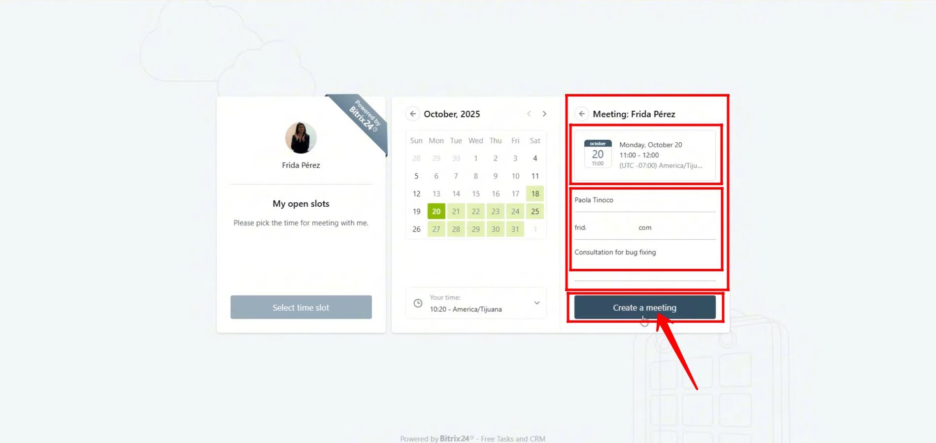 At the same time, the booked slot will automatically be added to the owner’s calendar, appearing in the corresponding date and time box that was selected by the client. Simply click on the event box in the calendar to view all the meeting details.