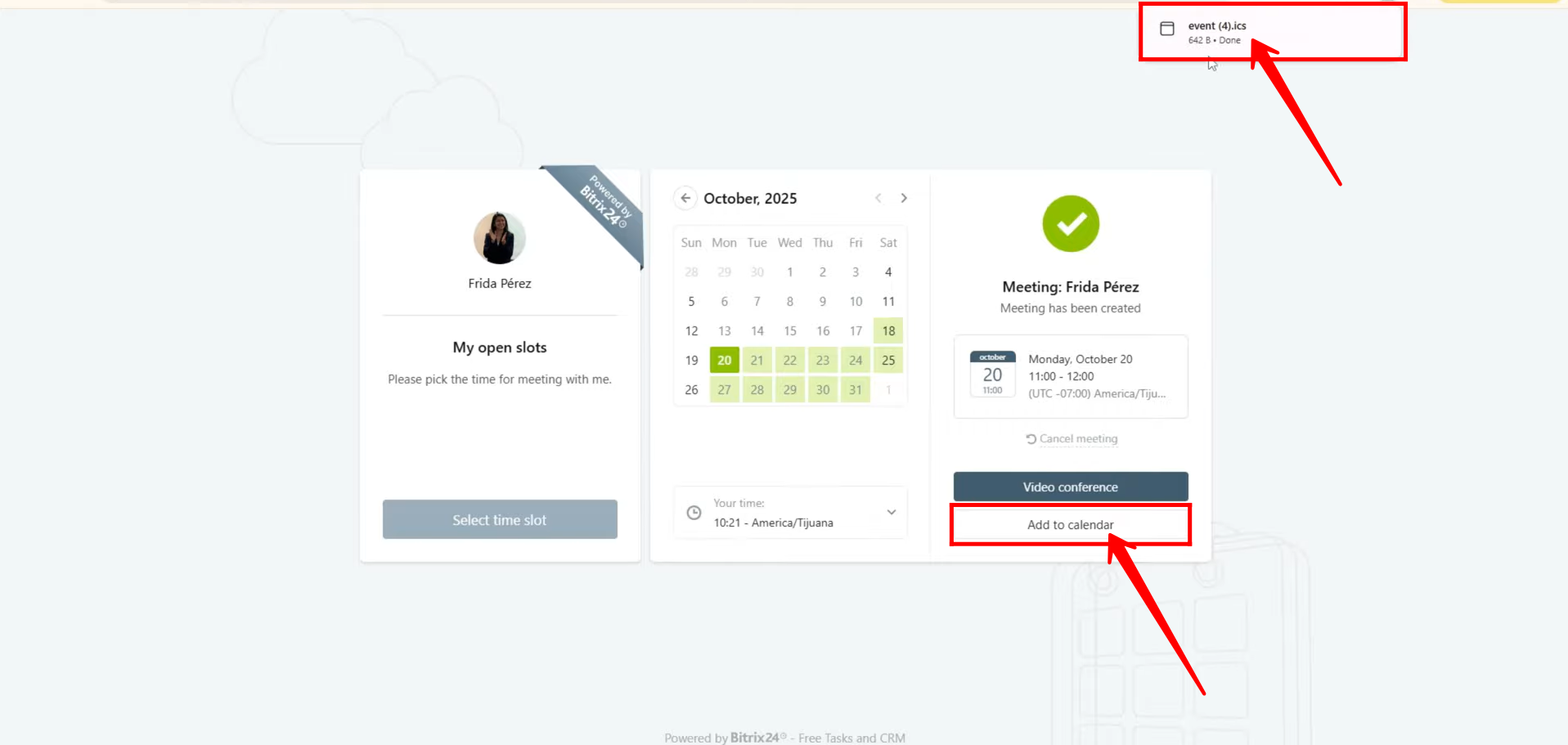 28. When the client books a meeting, they will receive an option to add the meeting to their own calendar. A file with the .ics extension will be automatically downloaded. This file can be easily imported into their preferred calendar application — such as Google Calendar, Outlook, or Apple Calendar — allowing them to block the scheduled time on their personal calendar as well.