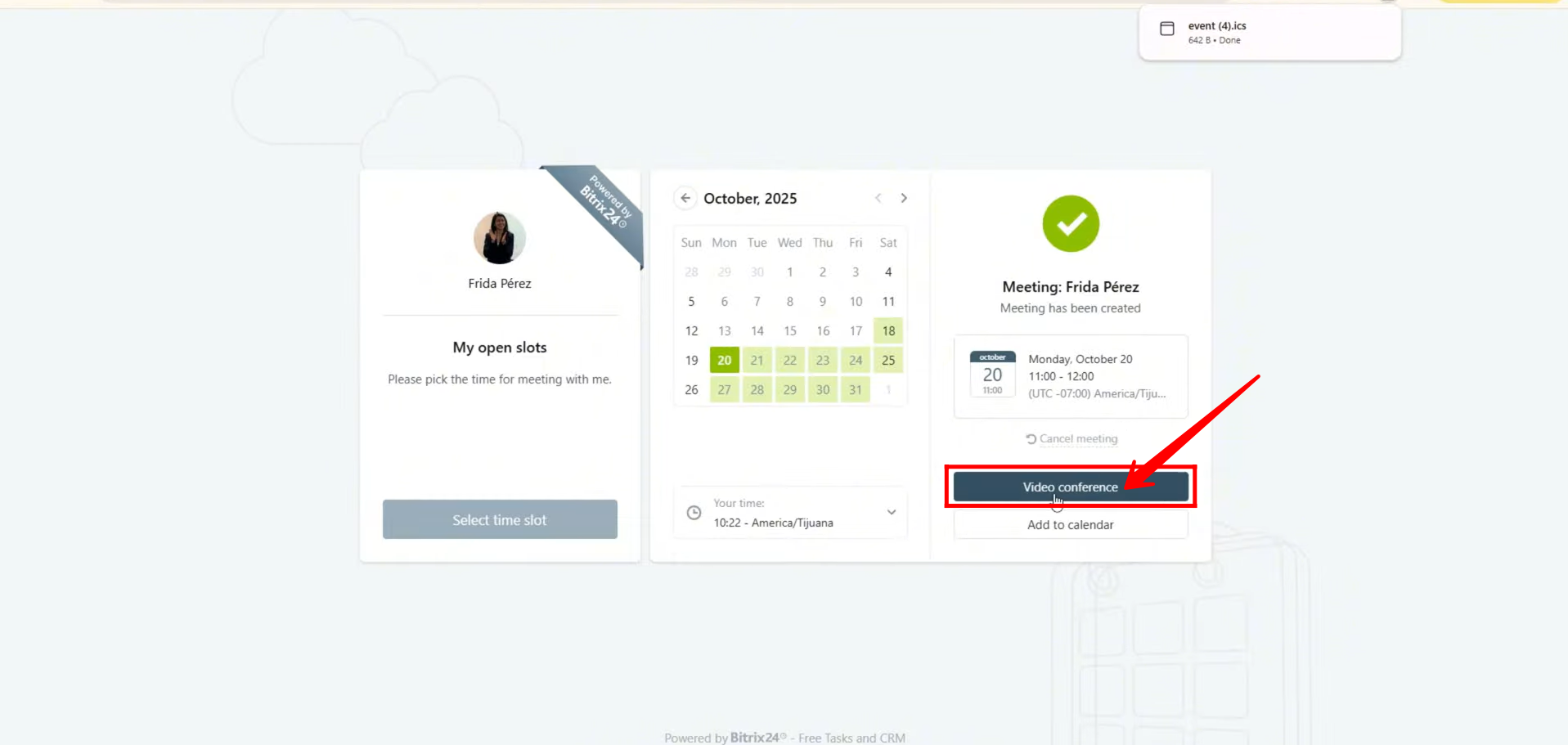 29. The client will also see a “Video Conference” button — which serves as the direct link to the scheduled meeting. Since this is a test scenario, we can preview the process: by clicking on the “Video Conference” button, the client will be redirected to the Bitrix24 video conference window, where the meeting will take place at the scheduled time.
