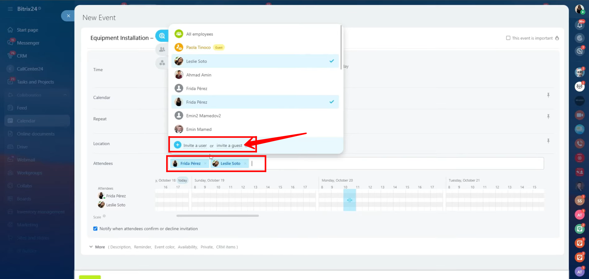 3. Select the attendees for the event so they receive notifications about it. You can choose specific employees, select all employees at once, or invite external participants. To include someone outside your organization, click “Invite a guest”.
