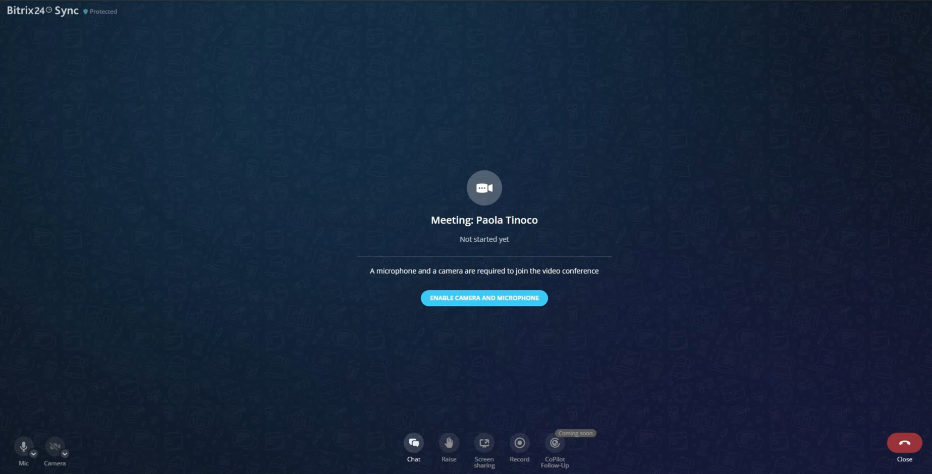 After opening the video conference link, the meeting window will appear — displaying the familiar interface with microphone, camera, and call end buttons, just as any standard meeting setup.