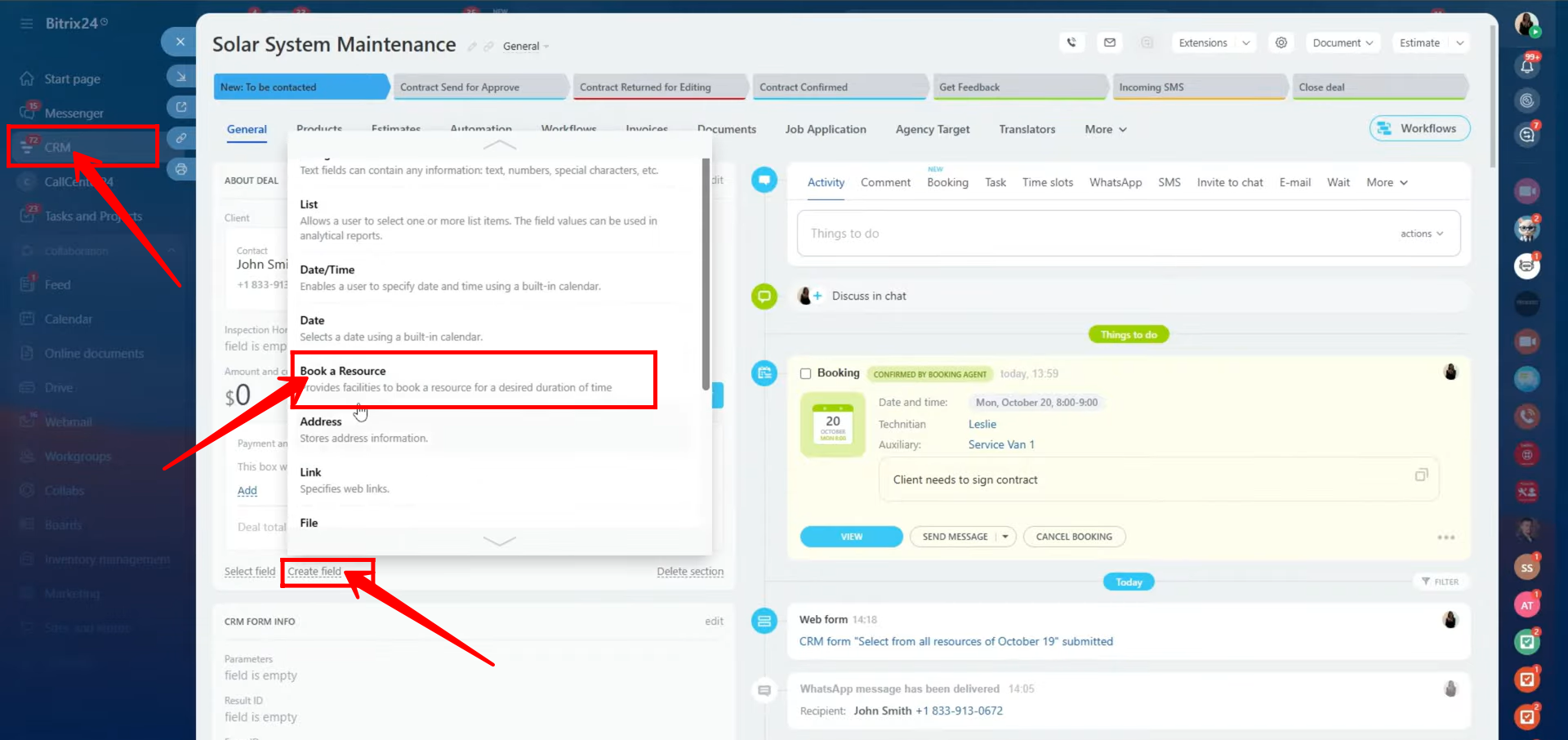 Next, create a new custom field of type “Book a Resource” to allow clients or team members to schedule meetings or reserve resources directly within the deal.