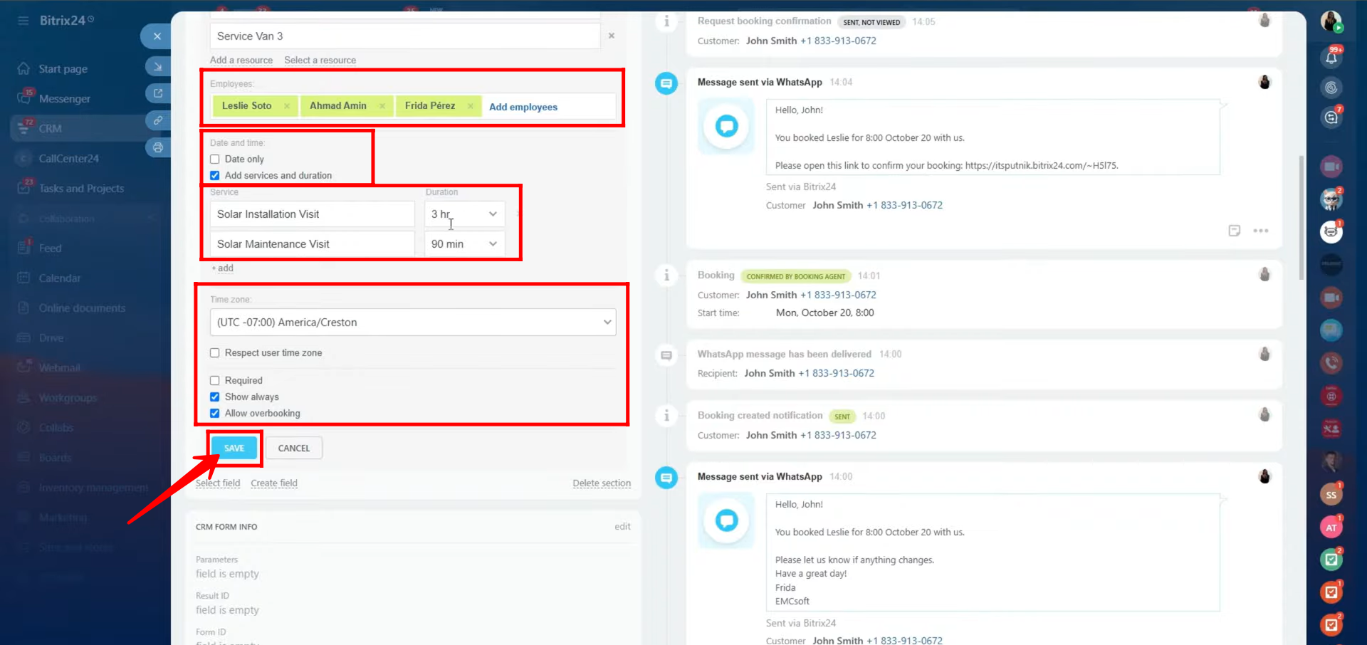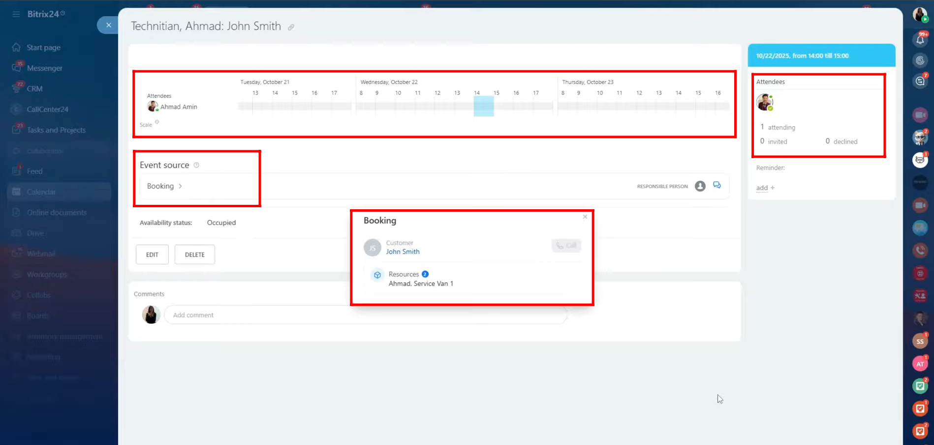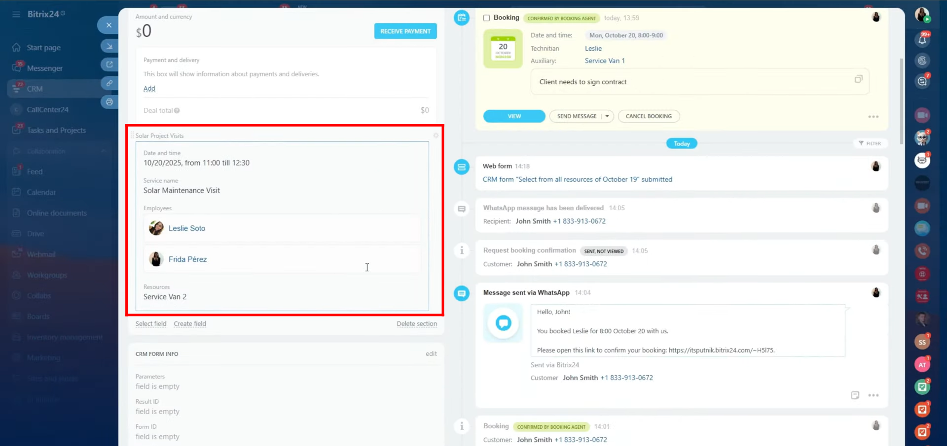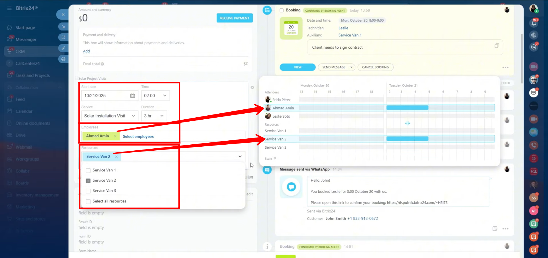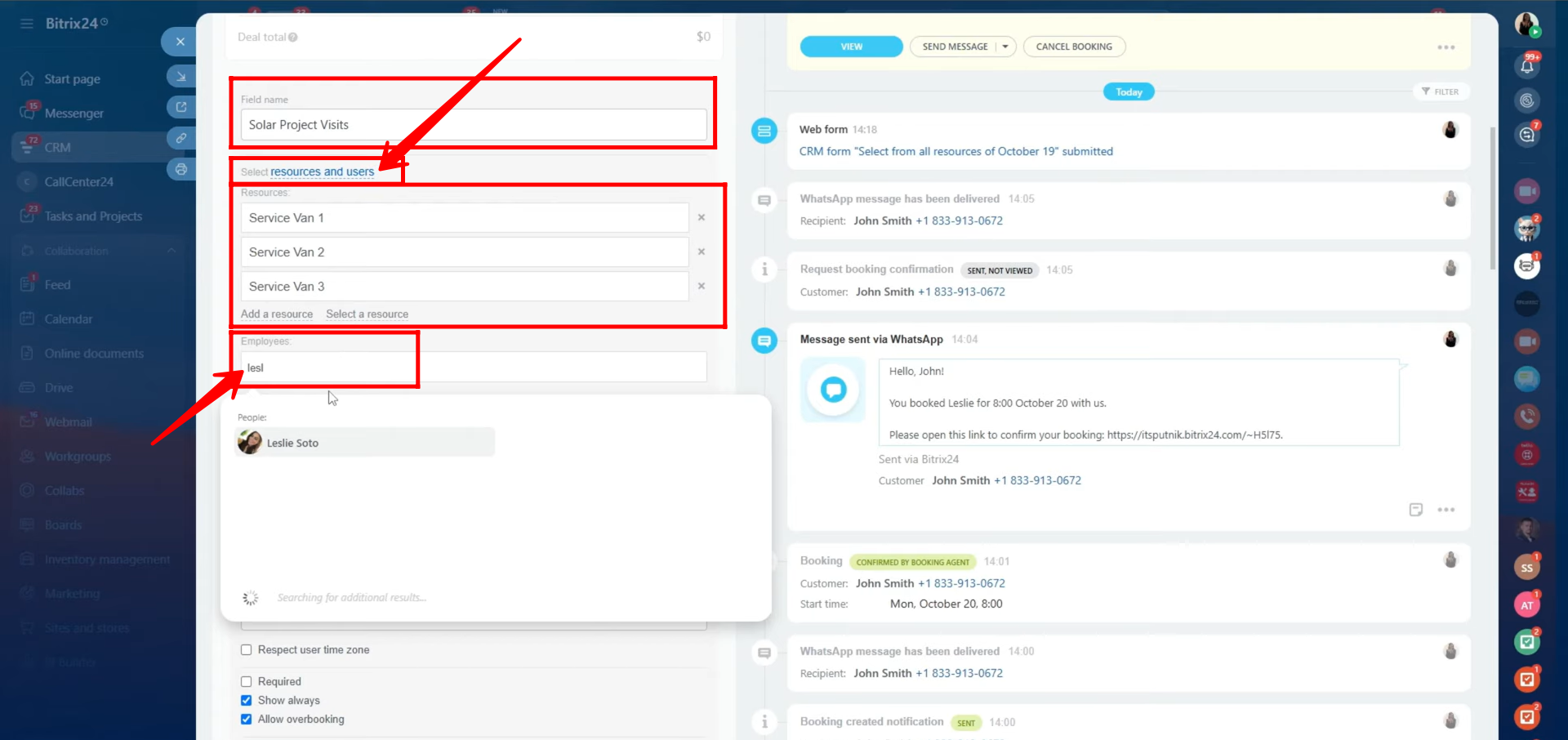 Additionally, Bitrix24’s Book a Resource function enables companies to manage not only employee availability but also physical assets like meeting rooms, service vehicles, or equipment. This ensures that resources and personnel are efficiently assigned to customer appointments or projects directly from the CRM. Overall, this feature bridges internal coordination and external communication, providing a smooth, all-in-one solution for scheduling, resource allocation, and client interaction.