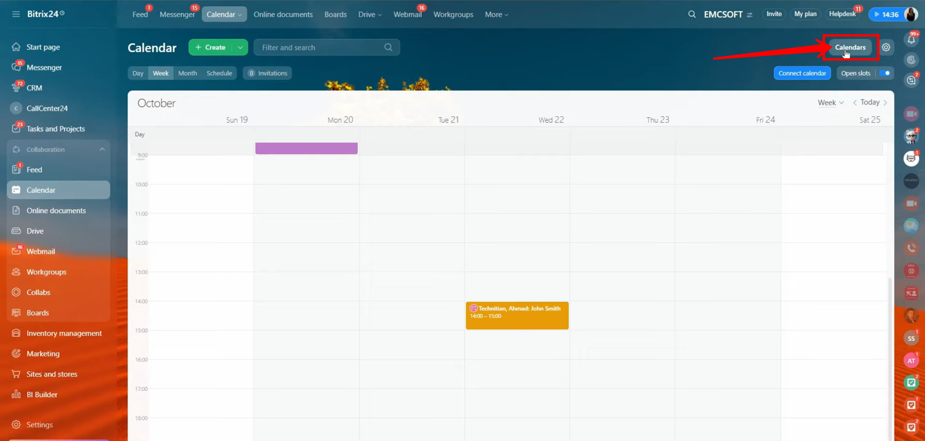 38. Go to the “Calendars” option located at the top-right corner of the window to view and manage multiple calendars simultaneously. Here, you can select different employees’ calendars (if you have access) to see their booked slots, each highlighted in different colors for clarity. This allows you to easily identify which time slots are occupied and by whom—all within the same calendar view.