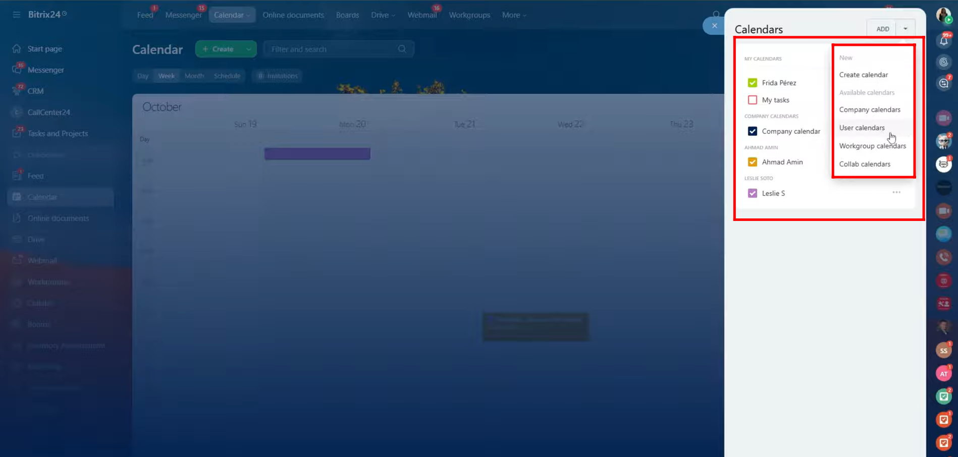 39. As you can see, you have the option to view various calendars — your personal tasks, user calendars, company-wide bookings, workgroup calendars, and collaborative calendars — or even create a new one. However, please note that you’ll only be able to view bookings or events in calendars to which you have access permissions.