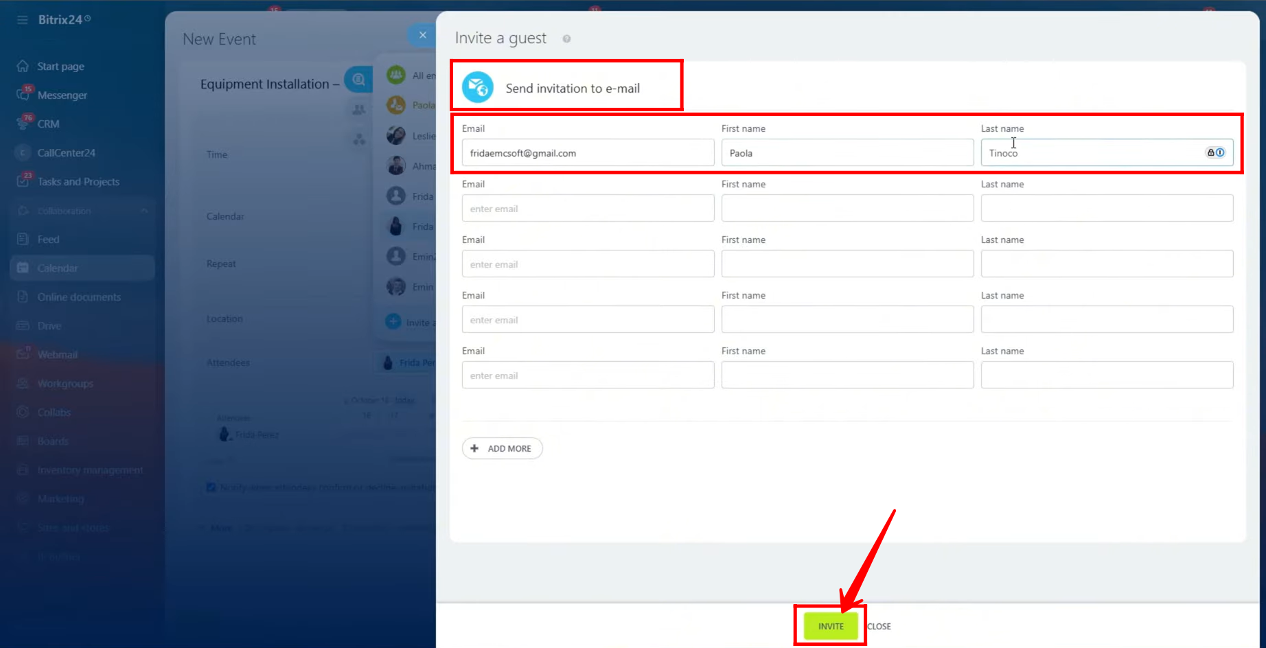4. In the Send invitation by email panel, enter the email address, first name, and last name of the person you wish to invite. You can add multiple guests at once by filling in their details in separate fields. Once all information is entered, click the “Invite” button to send the invitations. Each invited guest will receive an email notification with the event details and a link to join or view the meeting.