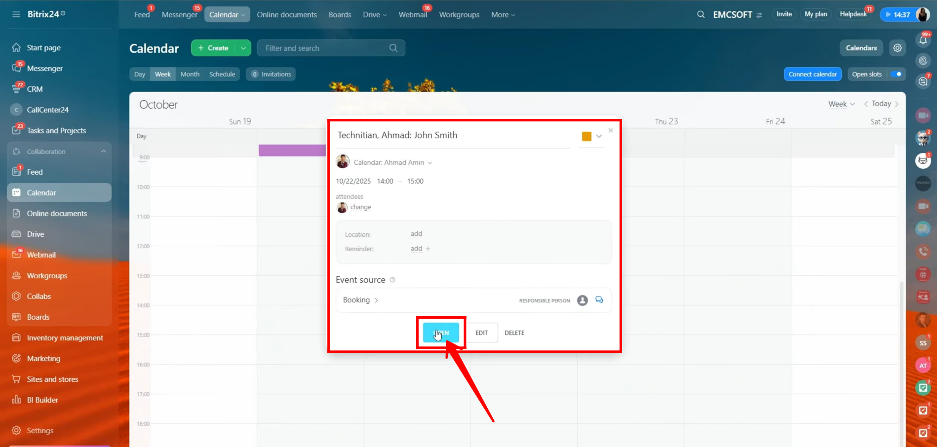 40. After clicking the booked slot in the calendar, you can see a summary of the booking details. To view all information in detail, click “Open”.