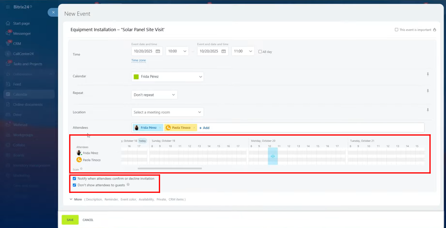 5. You can now view the time lapse of all added attendees along with the fixed event time. If the availability of both attendees overlaps, the unavailable time slots will appear in red, while the available ones remain blue. You can also enable the checkbox to receive notifications when attendees accept or decline the invitation. Additionally, there’s an option to hide the attendee list from guests by checking the respective box, ensuring privacy for internal participants.