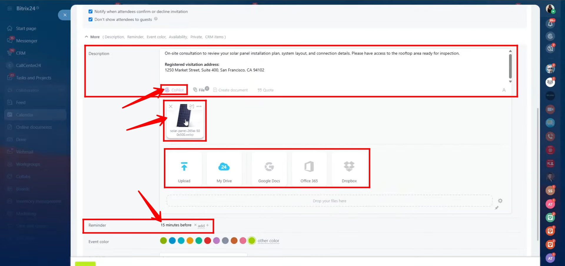 6. Click the “More” option for advanced configurations. Here, you can add a detailed description of the event and attach media such as pictures or files from various sources including your local device, Google Drive, Office 365, or Dropbox. You can also take assistance from Copilot to generate text or images for your event description. Additionally, set a reminder time to ensure timely notifications — for instance, you can set it to remind you 15 minutes before the event starts.