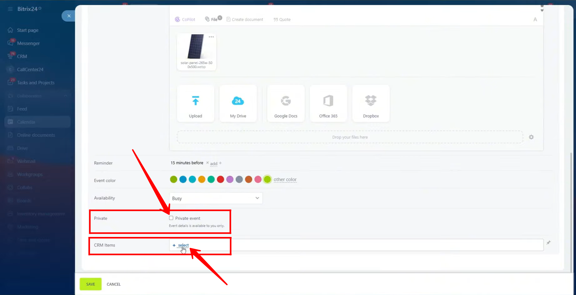 7. You can also choose to make the event private, ensuring that the event details are only visible to you. Additionally, you have the option to link a CRM item — such as a deal, lead, or contact — to this event. This helps maintain a direct connection between your meeting and the relevant CRM record, keeping your workflow organized and all related information easily accessible.