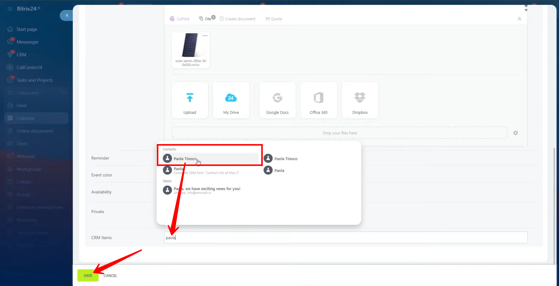 8. In this example, a contact (CRM item) is being linked to the event to keep the meeting associated with a specific client record. Once all necessary modifications are made — including event details, attendees, reminders, and CRM connections — click “Save” to apply the changes and finalize the event setup.