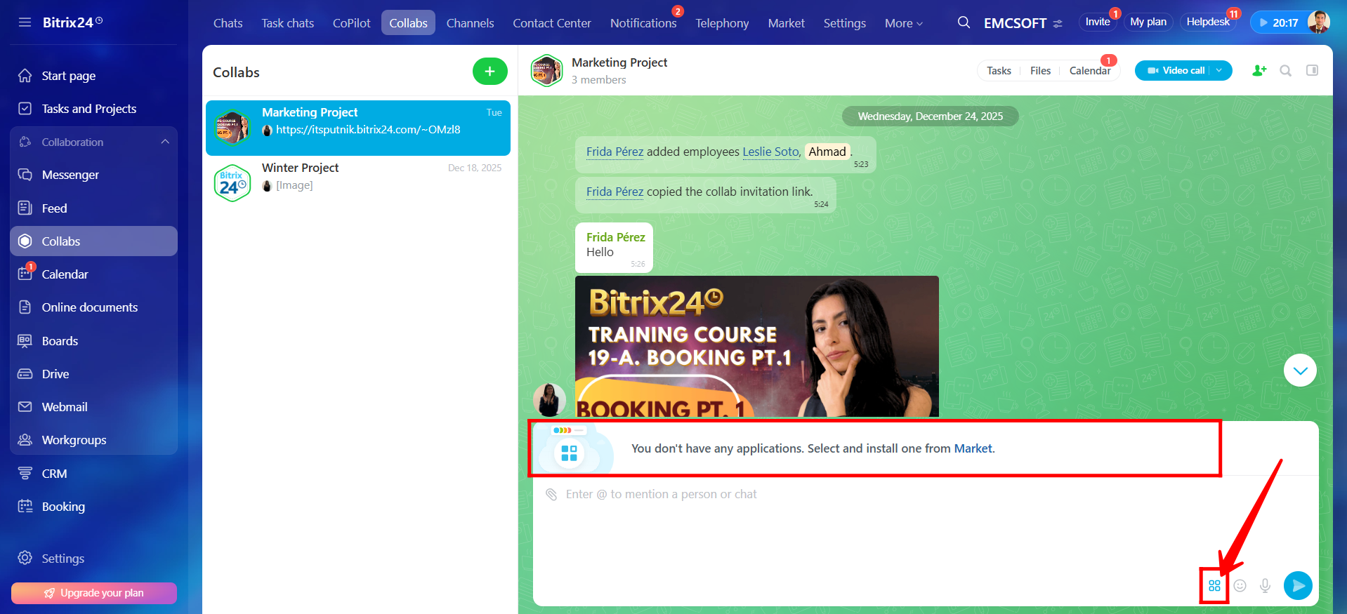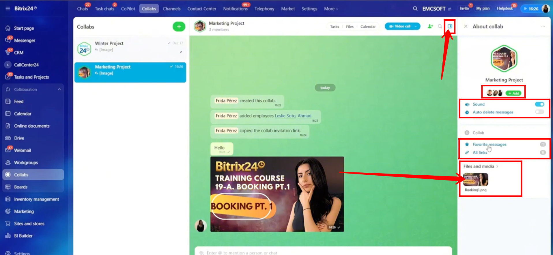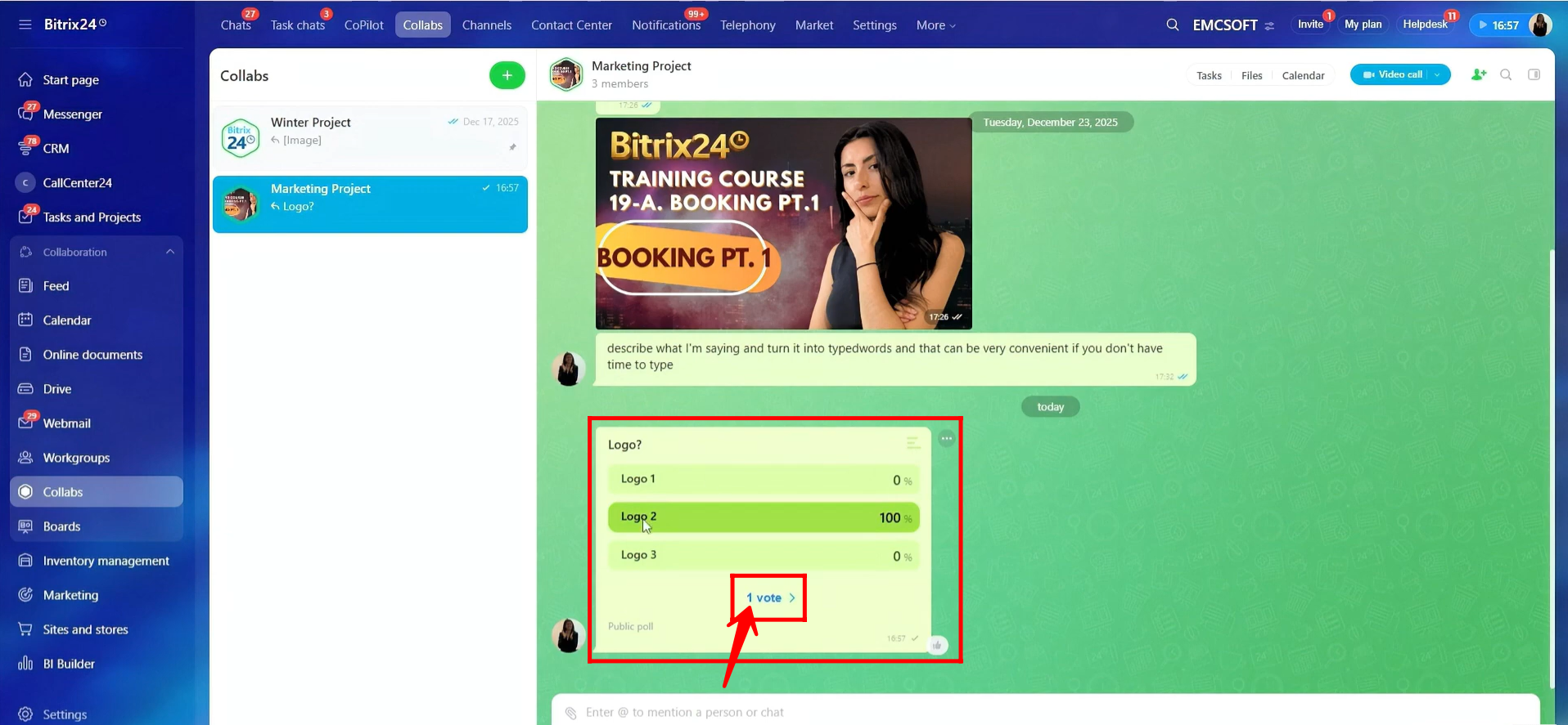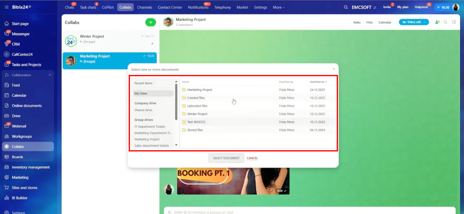 22. Here, you can select any file from the Bitrix24 Drive, not only files related to this collab. Once selected, you can share the file directly in the chat.