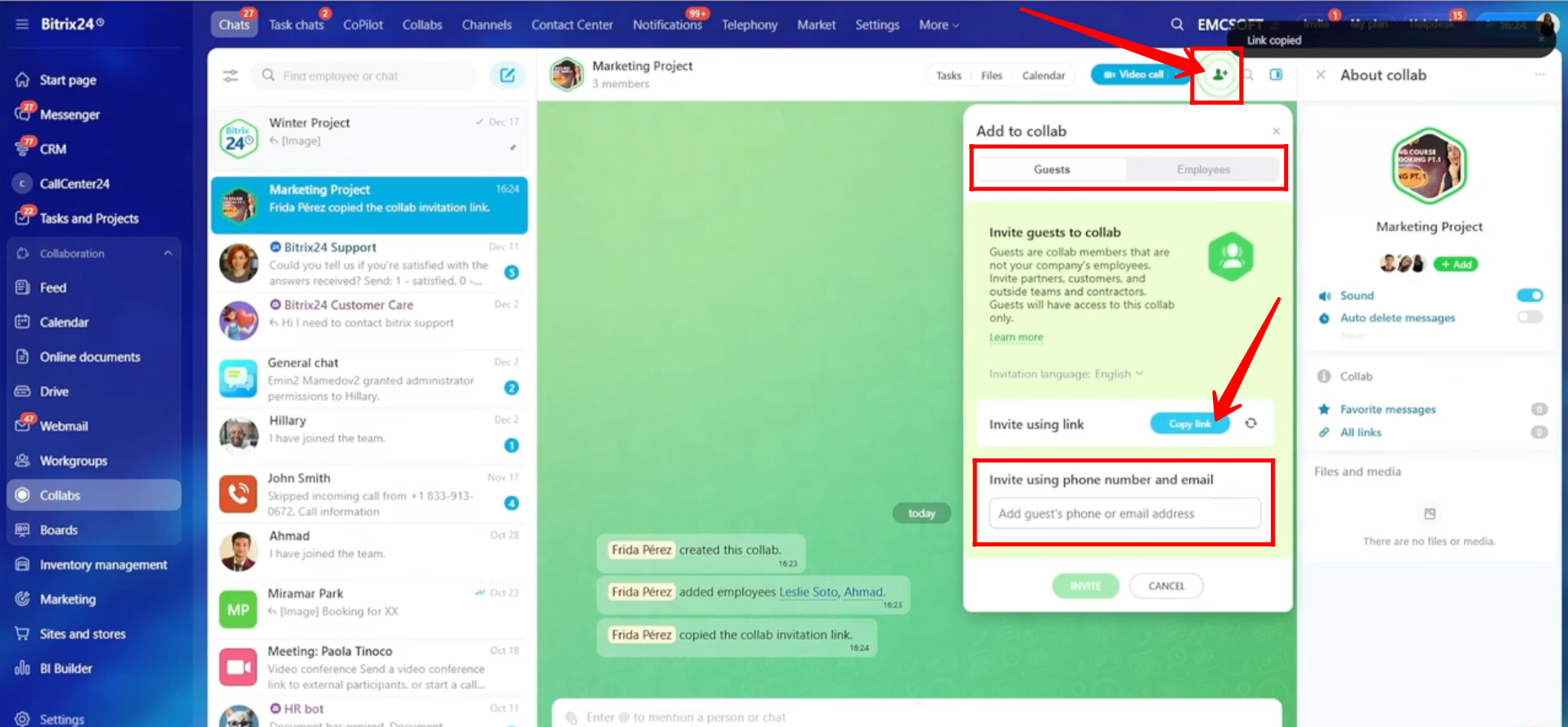 To invite someone outside your company, switch to the Guests section. You can copy the collab invitation link and share it with them. When they click the link, they can access the collab chat from their own Bitrix24 portal. Alternatively, you can enter their email address or phone number, and the invitation link will be sent to them automatically.