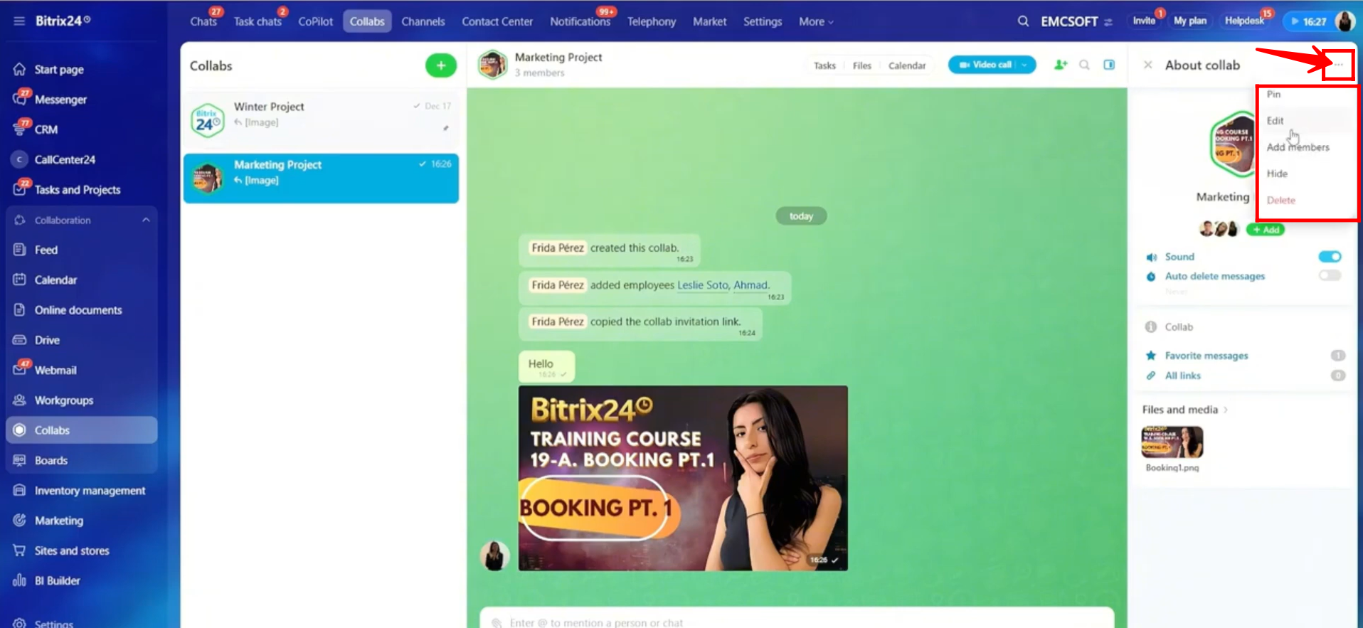 14. If you have the required permissions, click the highlighted three-dots menu. From here, you can pin the collab, edit access permissions, add more members, or hide or delete the collab.