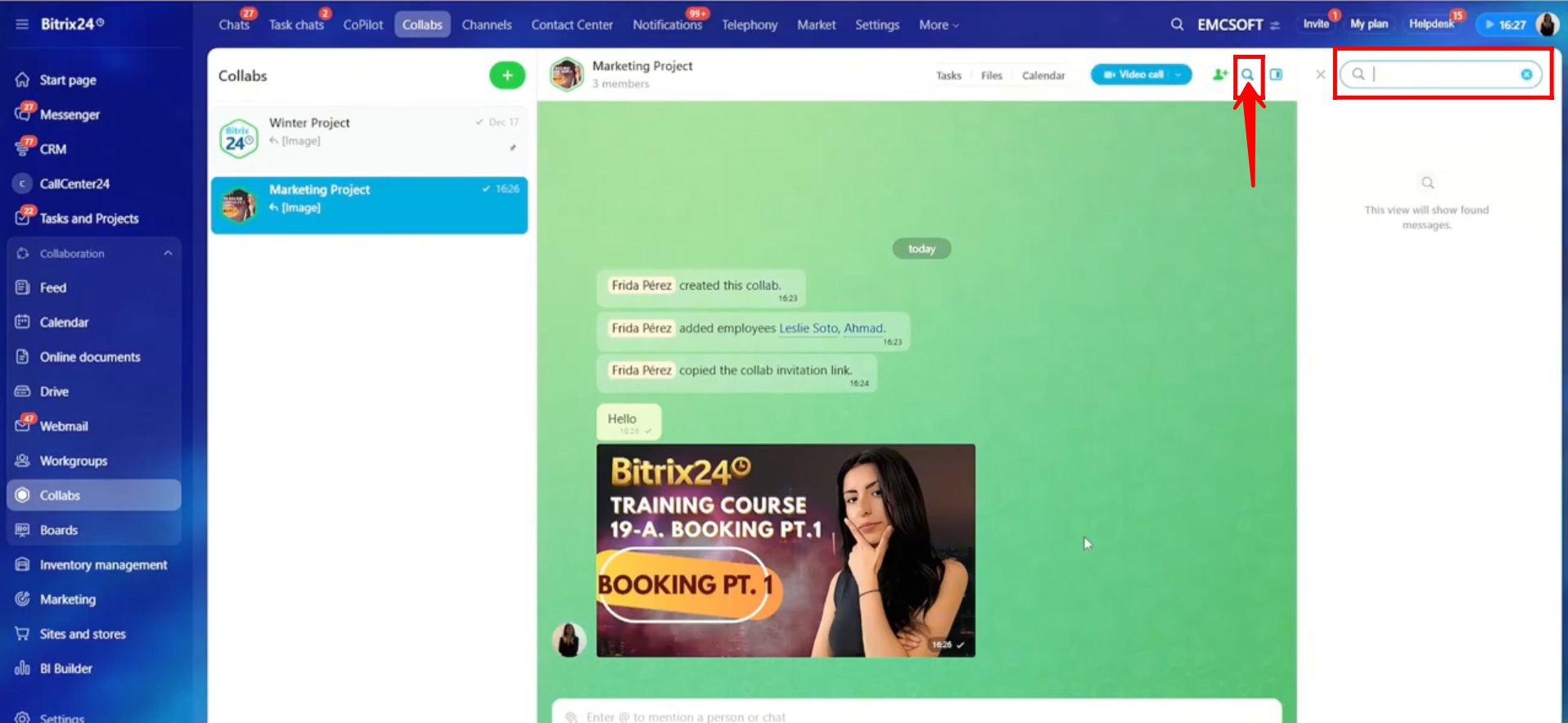15. Click the highlighted search icon and type in the search bar to find a specific message or file from the collab chat history. When you select a result, you will be taken directly to that message in the chat.