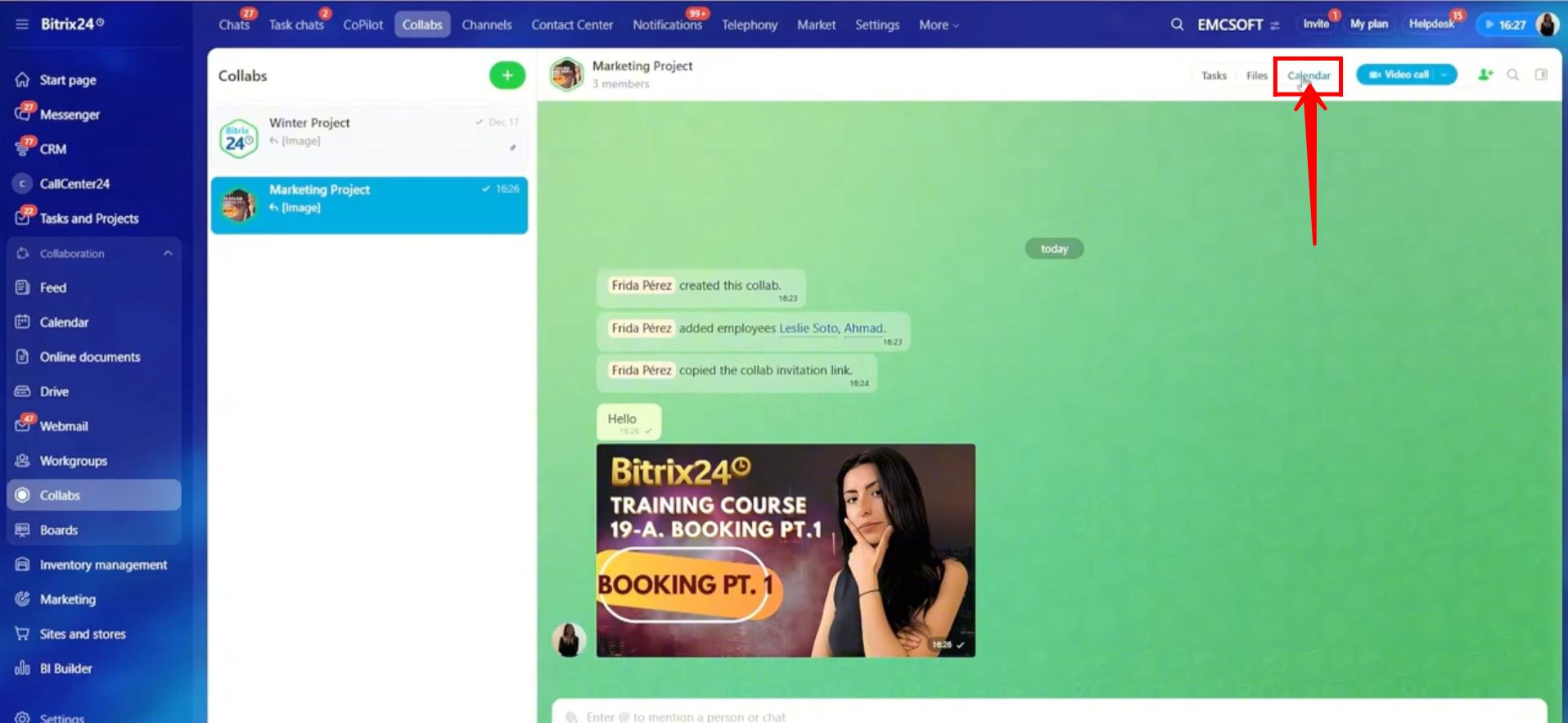 17. Click Calendar to view the calendar created specifically for this collab. This calendar is used to manage events and tasks related to the collab.