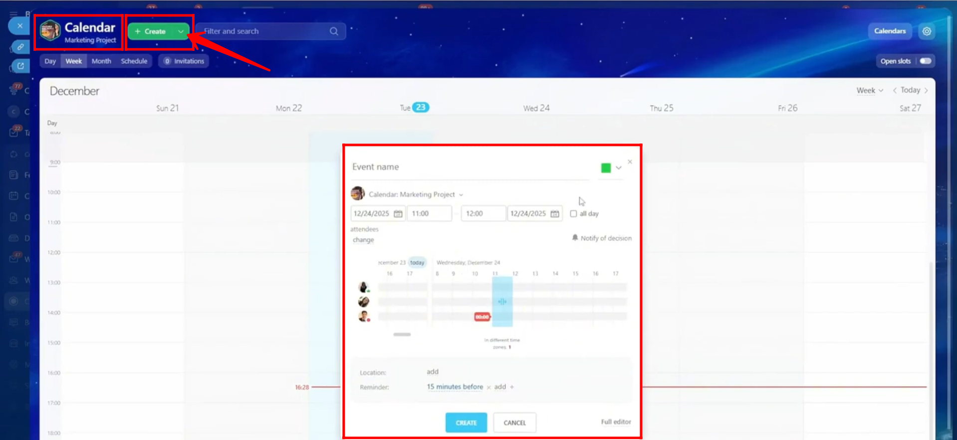 18. You can click on a specific time slot to quickly create an event, or use the Create dropdown to choose whether to create an event or a task. You can also click Calendars in the top-right corner, next to Settings, to select multiple calendars and view all related events and tasks at the same time.