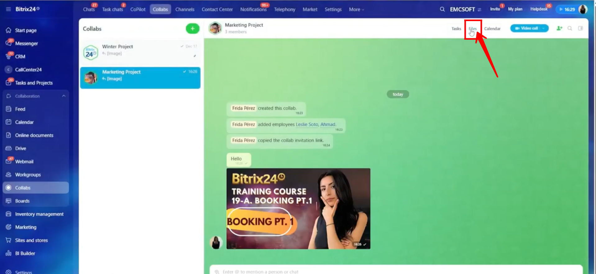 19. Now, click Files, and you will be redirected to the Bitrix24 Drive. Here, all files related to this collab are stored in a dedicated folder created specifically for it.