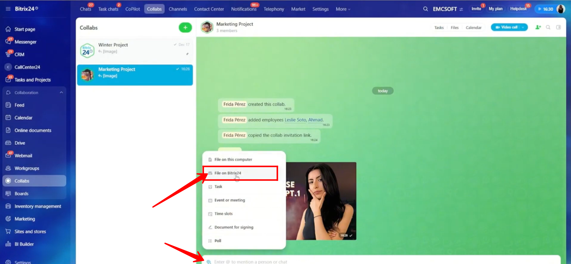 21. In the chat input box, click the highlighted icon. You will see the option “Files on Bitrix24” under “Files on this computer.” Click Files on Bitrix24 to proceed.