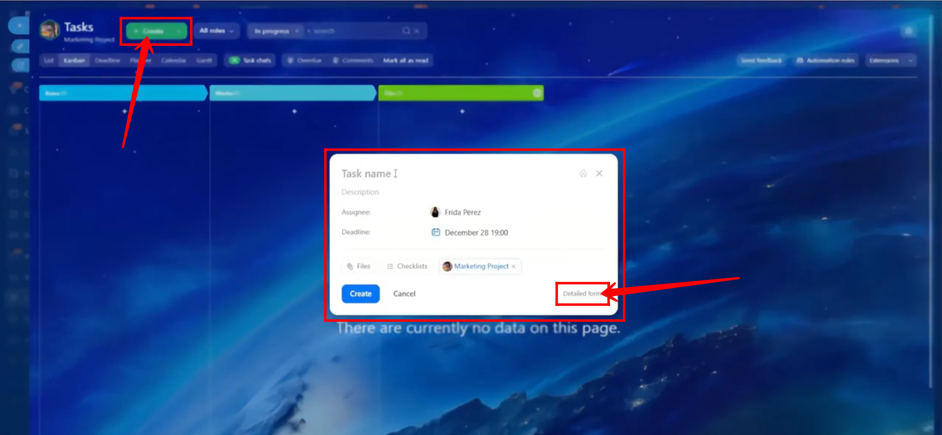 25. By clicking “+ Create”, a quick task editor will appear, allowing you to add basic information and create a task quickly. You can also click “Detailed form” to open the full task editor and add more detailed information.