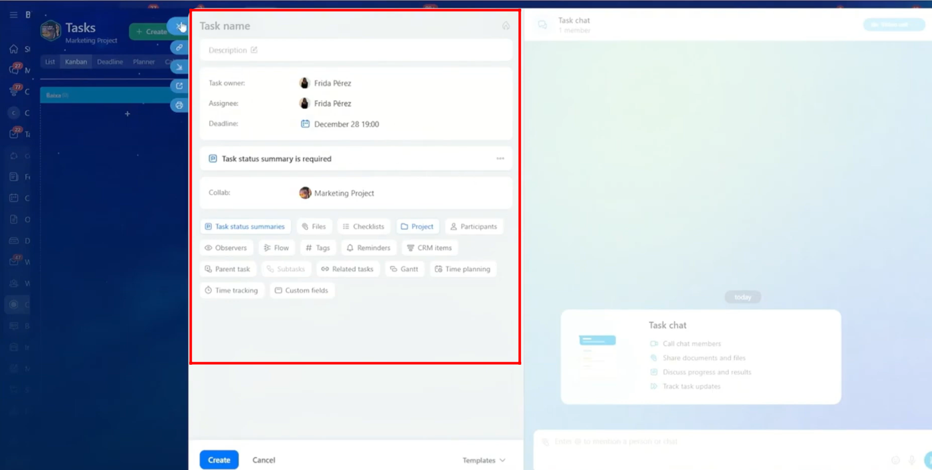 26. You can add the task name, description, task owner, assignee, and deadline. You can also set reminders, add tags, attach files, and include any other required details. This task will be specifically linked to the current collab.