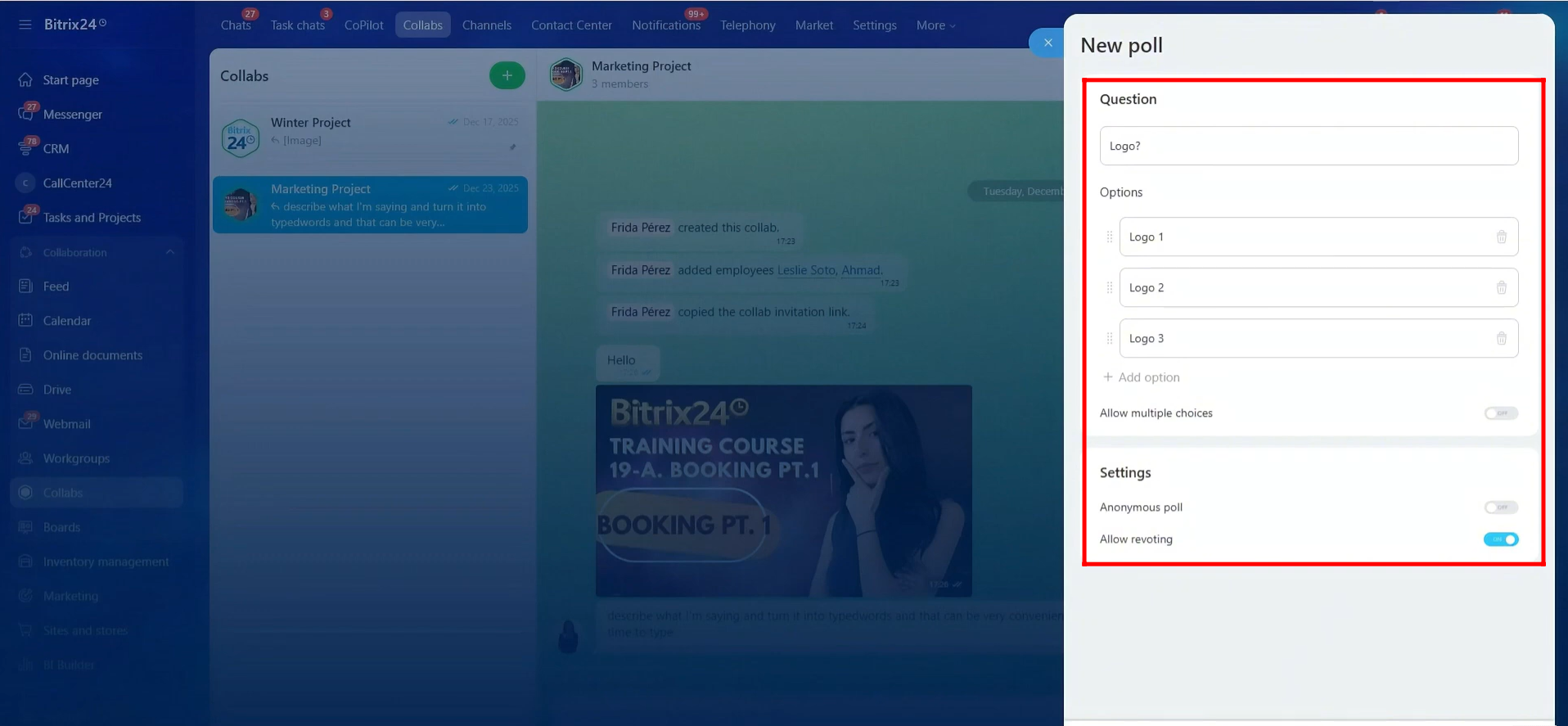 31. Enter the poll question and add the available options. You can enable or disable the option to allow multiple choices. In the poll settings, you can also turn anonymous voting on or off and choose whether to allow revoting.