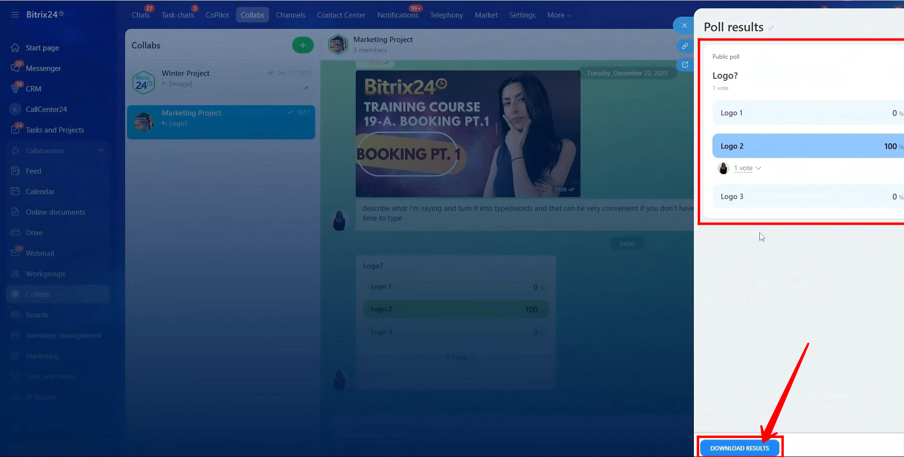 33. Poll results can be viewed in the sidebar, where you will see the percentage of votes for each option along with the profiles of members who voted. You can also download the poll results in Excel format for reference or reporting.