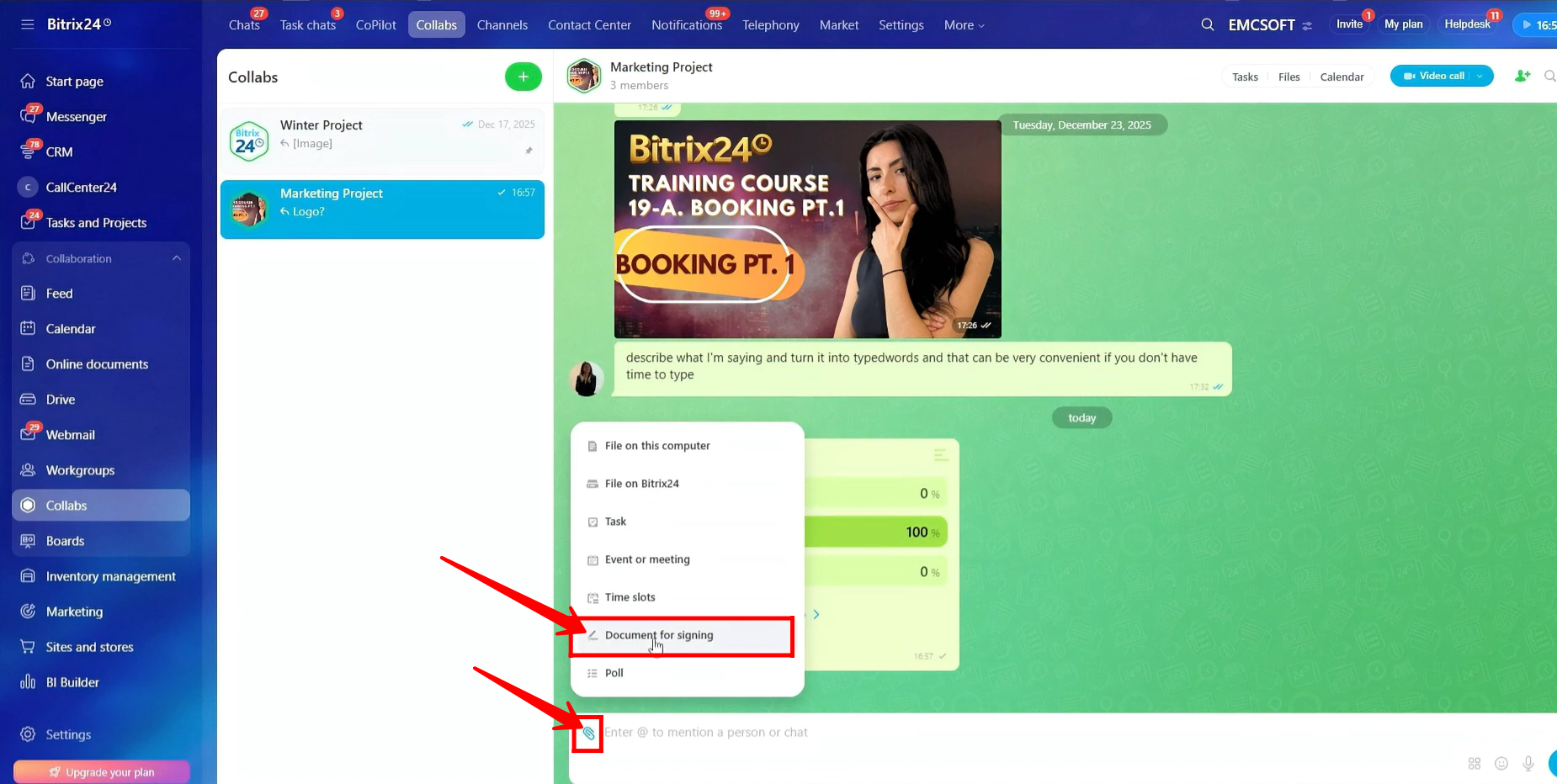 35. Click the highlighted icon in the chat input window, then select “Document for signing.”