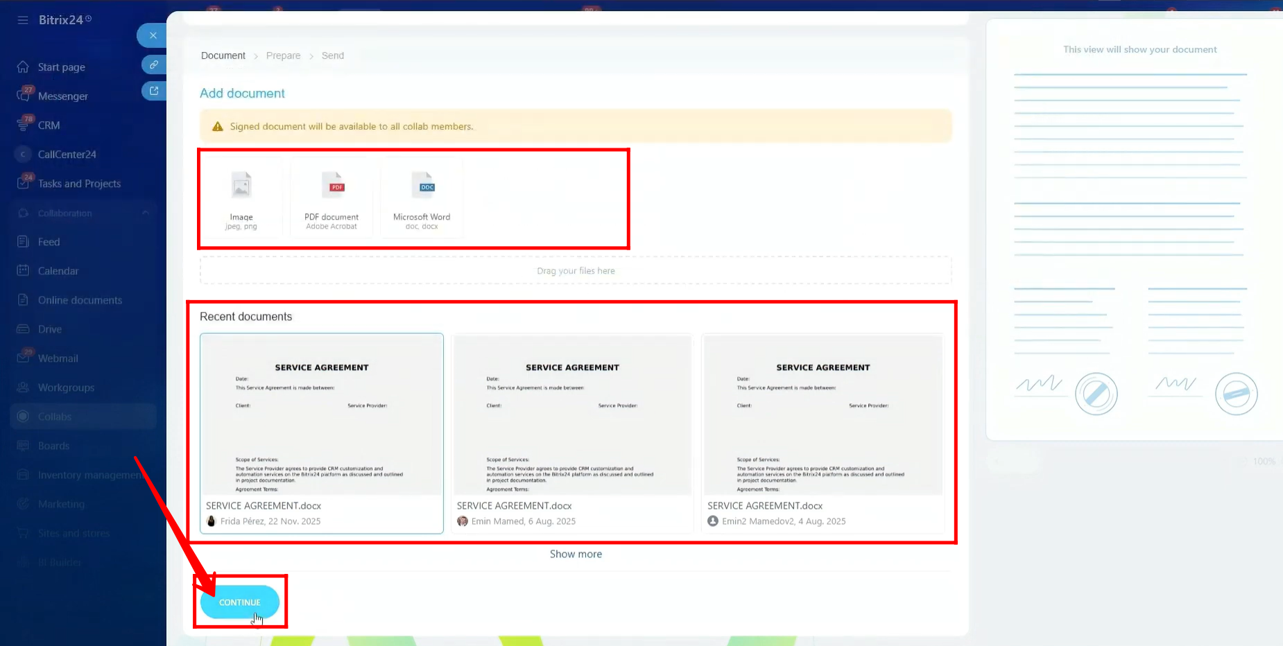 Here, you can upload a document template to be signed or select from recently configured documents. After making your selection, click Continue to proceed.