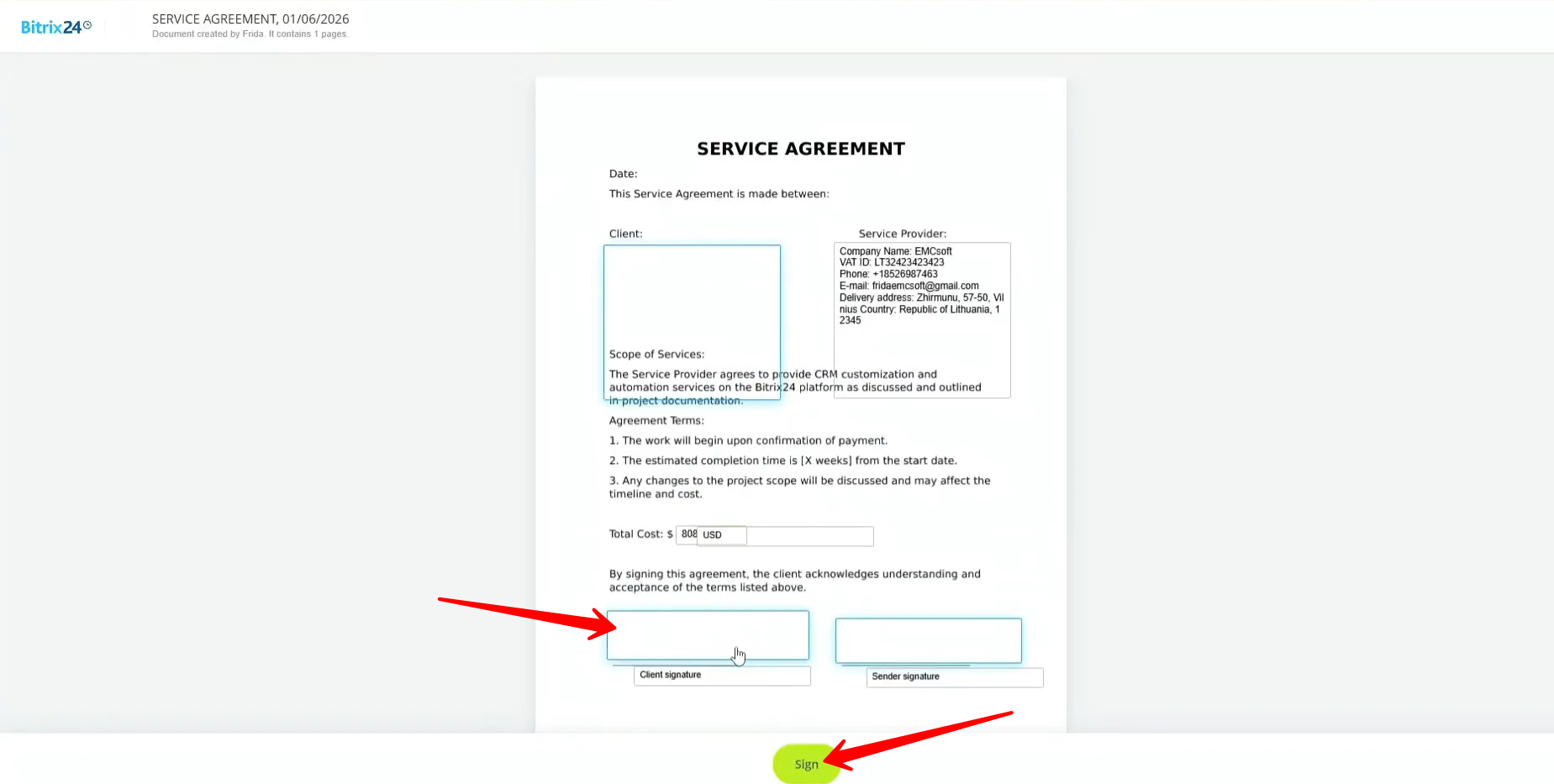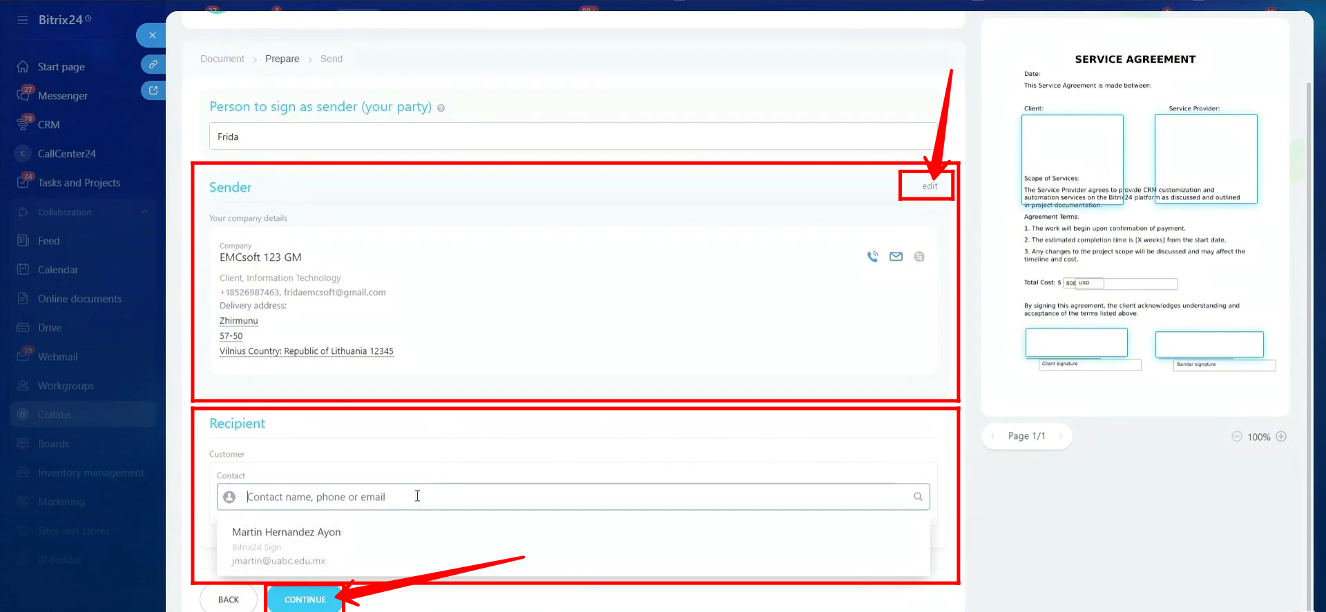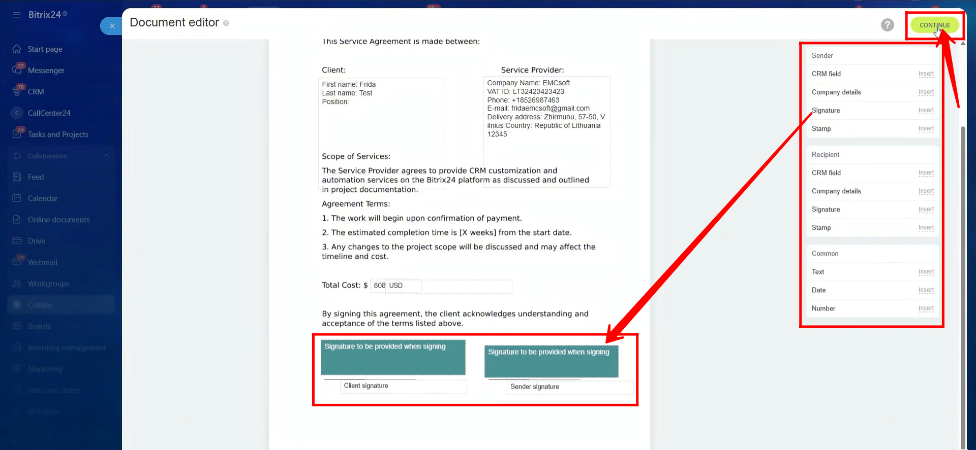 38. In the document edit mode, you can modify the template by placing signature fields for the sender and receiver. You can also add placeholders for company details, include dynamic CRM fields, and insert elements such as date, text, or number fields. Once you’re done, click Continue to proceed.