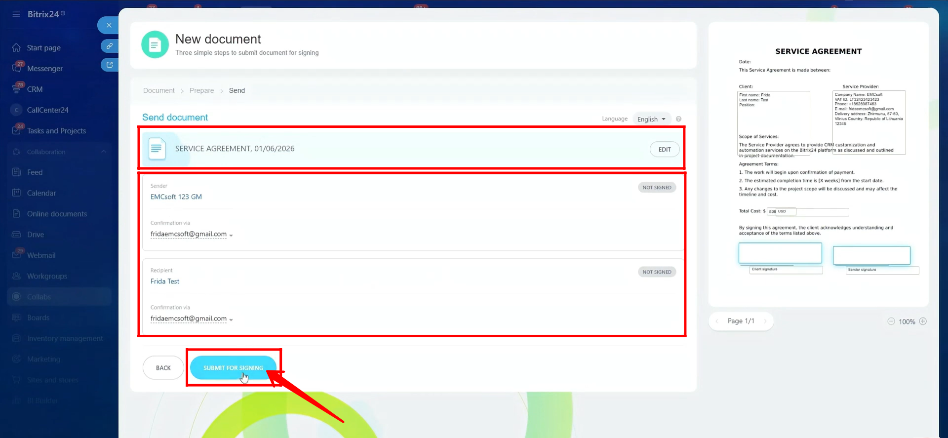 39. Here, you will see the final document with all details, including the document content and sender and receiver information. After reviewing everything, click Submit for Signing to send the document.