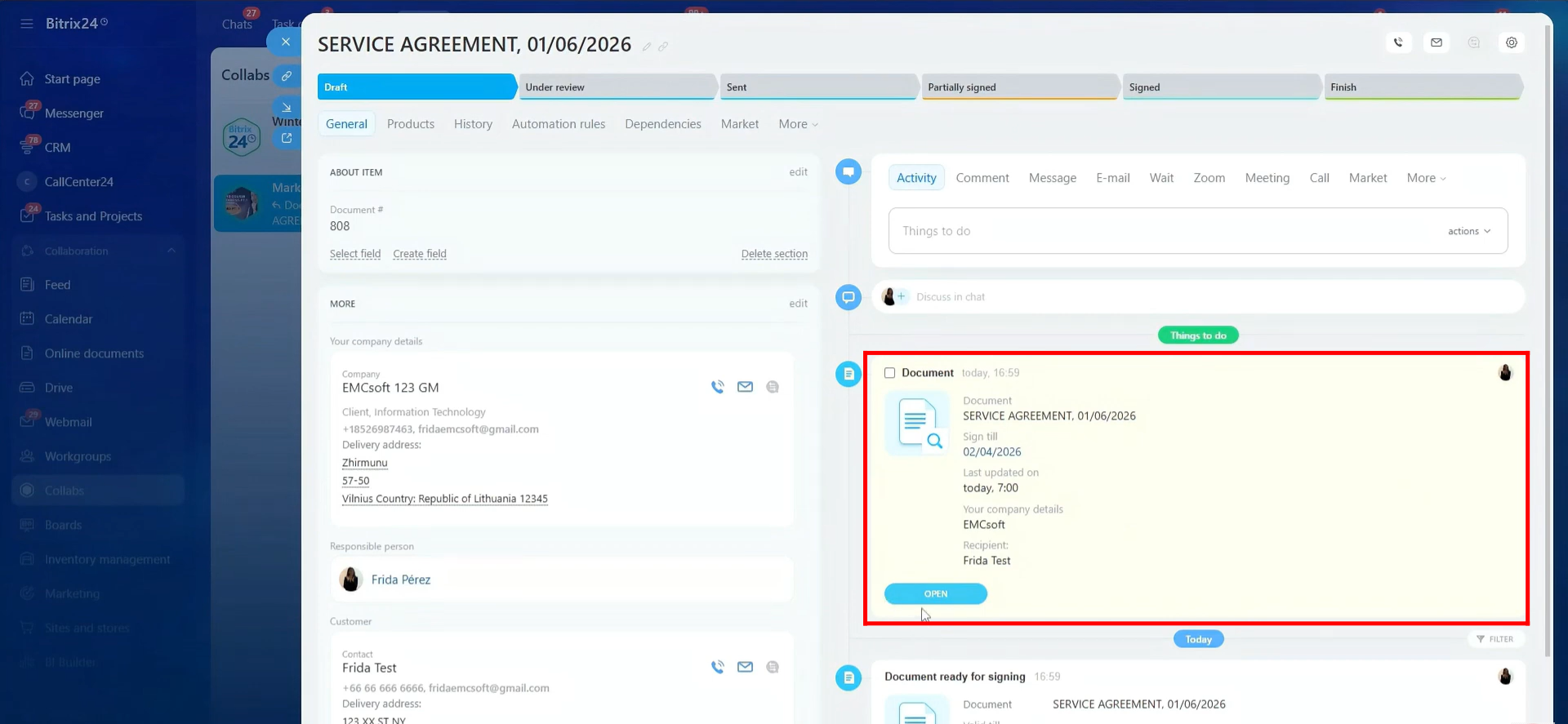 40. A new entity item will be created with the document’s name. In the activity timeline, you will see that the document has been sent for signing to both the sender and the receiver at their respective email addresses.