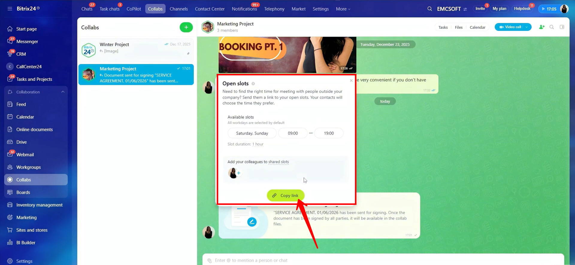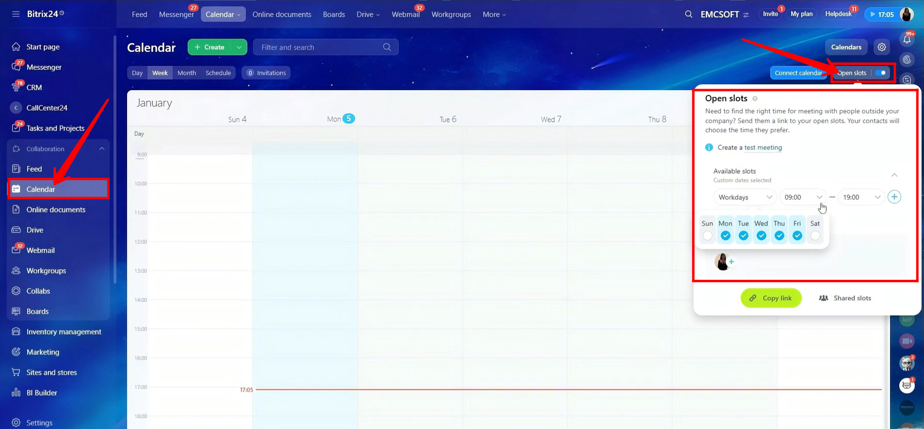 46. Go to Calendar and click Open Slots. Here, you can edit availability for weekdays, weekends, or specific dates, and define the available time ranges for each day. You can also share time slots with other employees, allowing the person booking the meeting to choose a specific employee. From here, you can copy the booking link if needed.
