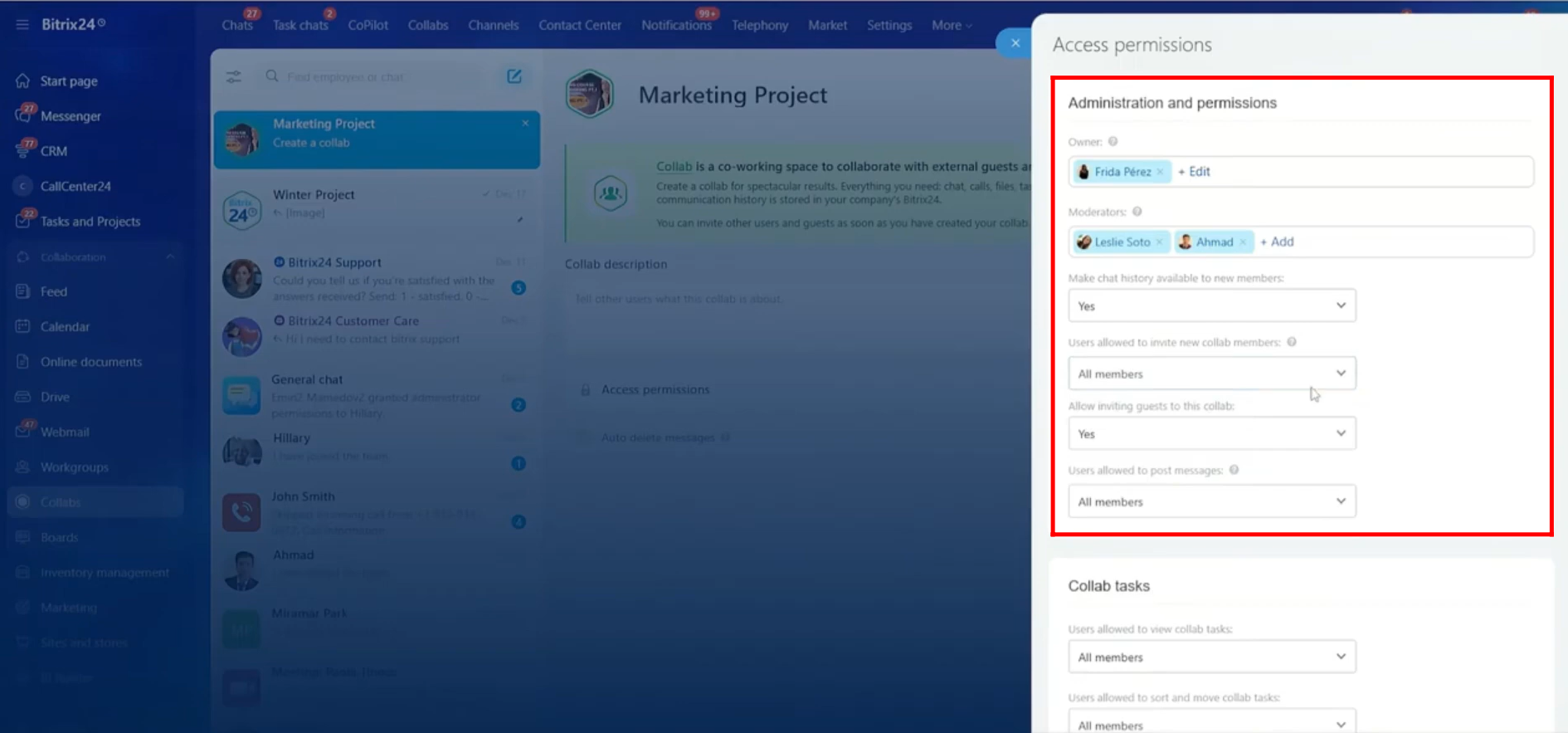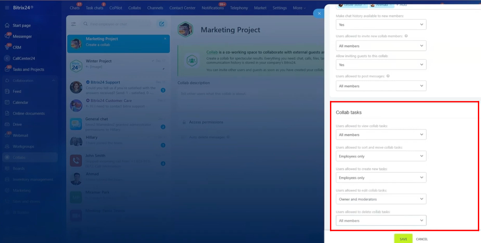 - Users allowed to view collab tasks: Owner only, Owners and moderators, Employees only, or All members
